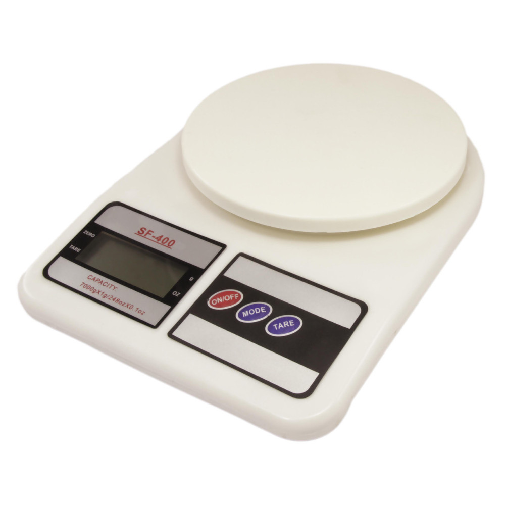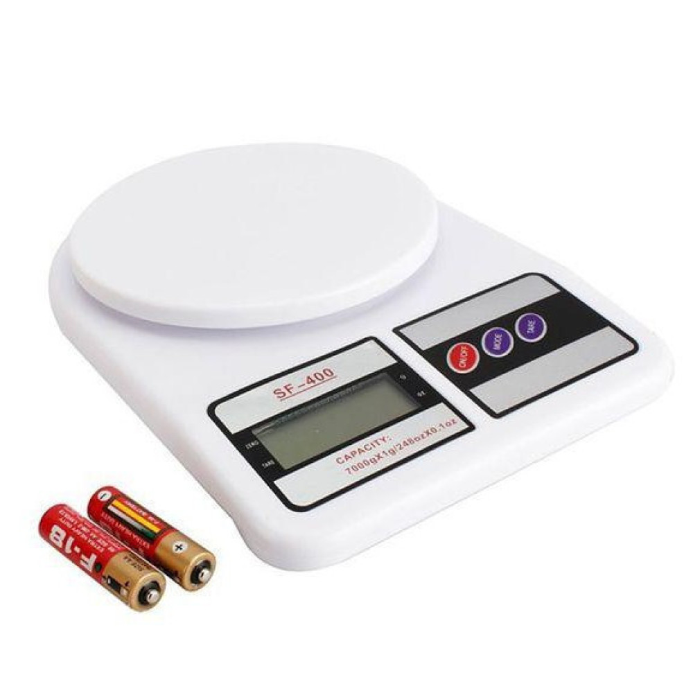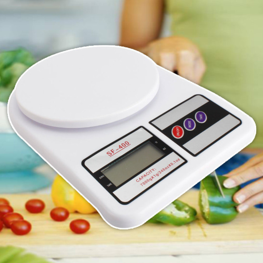 Прибор выполнен в белом корпусе. Предел взвешивания: 10 кг. Весы Electronic Kitchen Scale SF-400 (Электроник Китчен Скейл) станут незаменимым помощником на кухне, если Вы готовите блюда либо выпечку, требующие максимально точного количества продуктов.