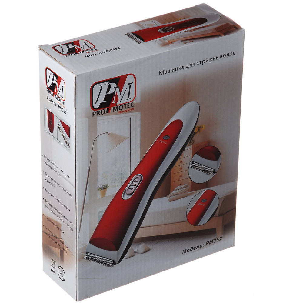 Надежная и качественная машинка PRO MOTEC (PM-352) для стрижки волос поможет создать прческу в домашних условиях.. Эта функциональная машинка для стрижки волос будет полезна как парикмахеру-профессионалу, так и тем, кто предпочитает стричься дома, не обращаясь в салоны. Благодаря удобству в использовании, машинка для стрижки волос станет просто незаменимой в повседневной жизни. А ваши любимые мужчины всегда будут иметь ухоженный вид. Эта машинка имеет надежные лезвия из нержавеющей стали. Корпус выглядит привлекательно и удобно размещается в руке.