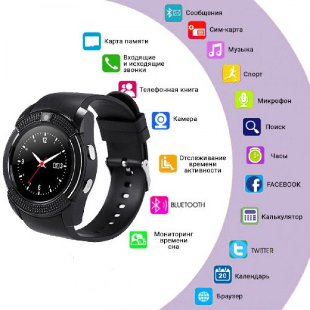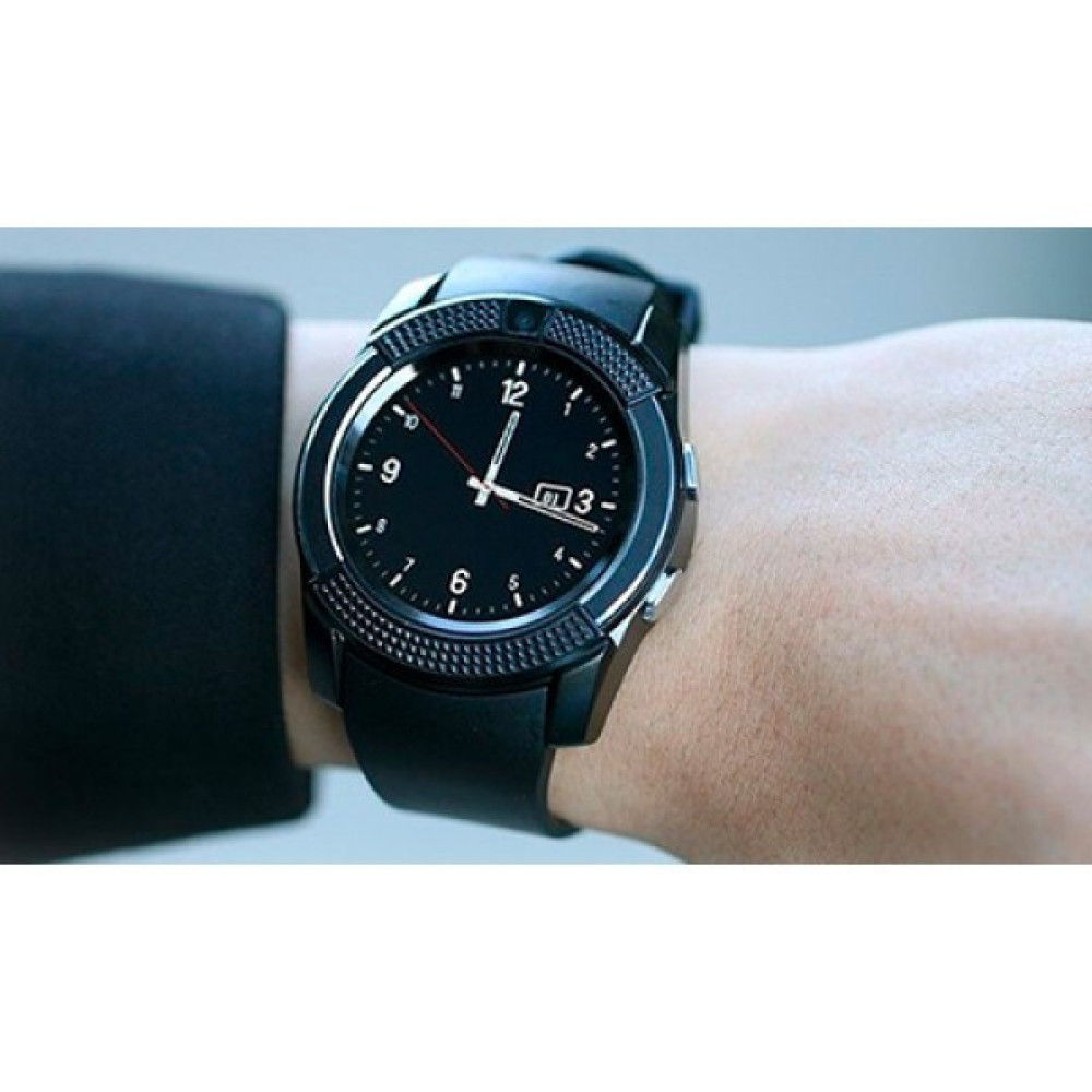 Часы Smart Watch V8 изготавливаются в круглом корпусе. Надо отметить, что последнее время все больше появляется новых моделей часов с круглыми циферблатами. И это хорошо – всегда хорошо, когда есть выбор. Дизайн Smart Watch V8 - ярко выраженный спортивный. Корпус – металлический, ремешок – из гибкого полимера. Современные часы Smart Watch V8 – это умный гаджет с большим набором функций. Меню устройства простое и разобраться в нём сможет даже ребенок. Обзор гаджета показывает, что это модное устройство, без которого не обойтись современному человеку. С левой стороны Smart Watch V8 расположен разъем для зарядки микро-USB, закрытый резиновой заглушкой, с правой – 2 кнопки. Под задней крышкой находятся съемный литиевый аккумулятор, слот для сим карты микро-SIM, а также слот для карты памяти микро-SD. В Smart Watch V8 доступно 3 экранных циферблата, включая классический стрелочный. Функции часов: