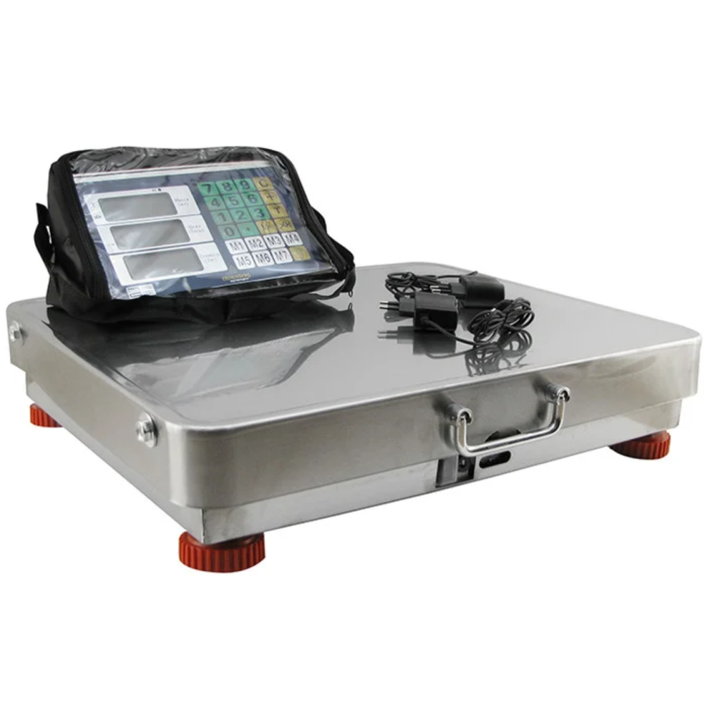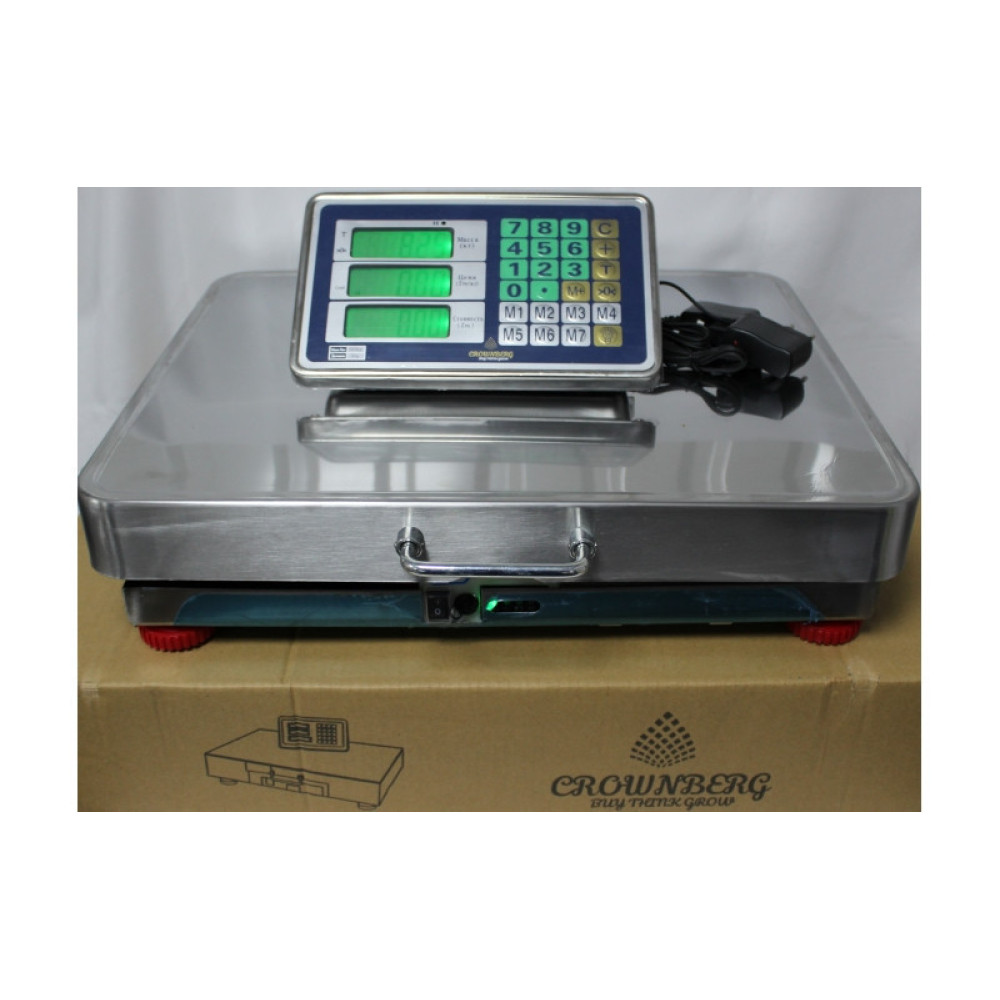 Блок управления имеет встроенный аккумулятор, который позволяет работать на весах без перерыва несколько суток и кнопки для ввода стоимости и сброса тары. Снизу платформы есть пластиковые регулируемые ножки. Внутри платформы есть аккумулятор, разъём для подключения блока питания, индикатор заряда аккумулятора. Сбоку платформы есть откидная металлическая ручка для удобства транспортировки весов.