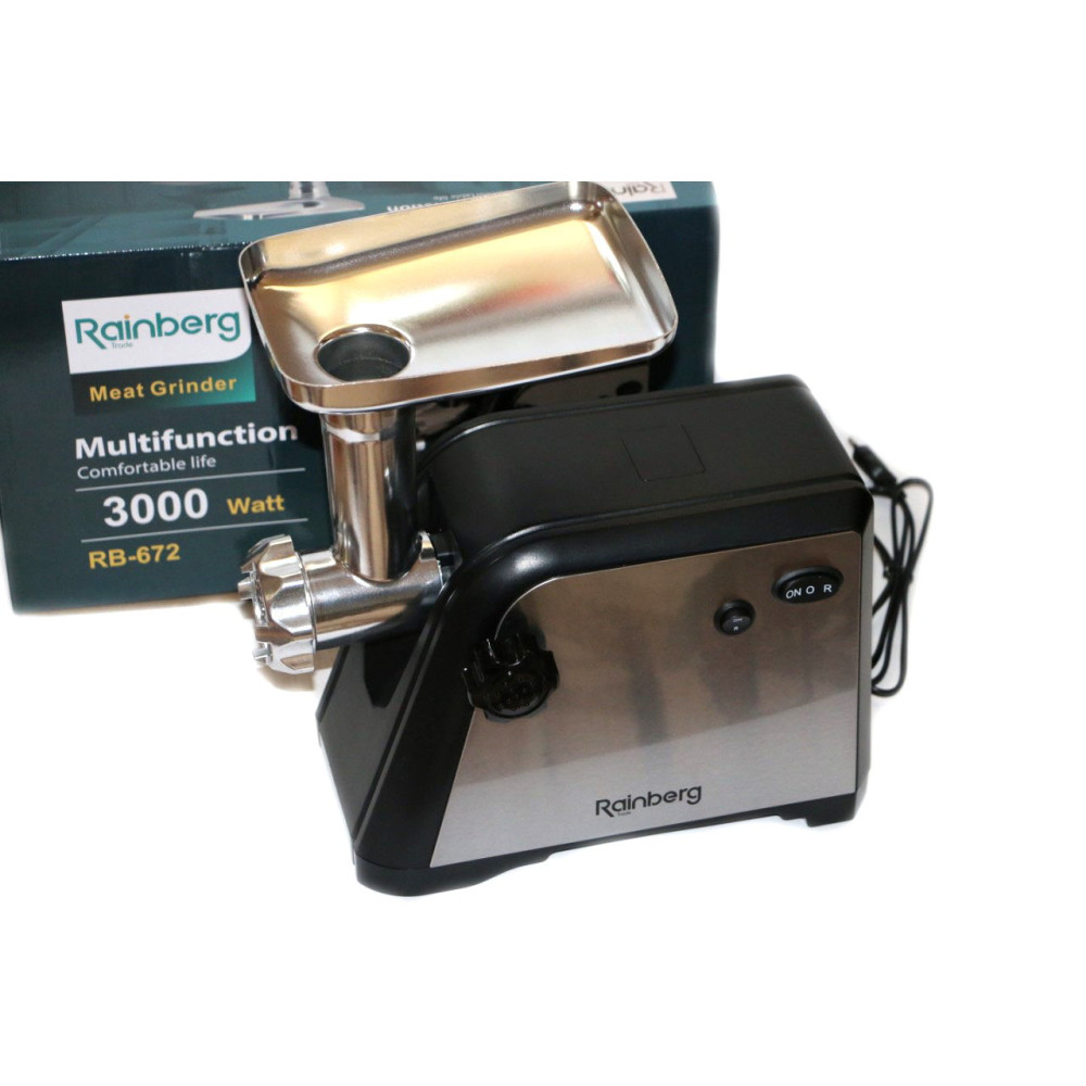 Универсальное устройство, которое сэкономит время и силы любой хозяйке электрическая мясорубка Rainberg Мощность 3000 Вт способна перемолоть мясо, рыбу, овощи, сделать любую нарезку, профилирования песочного и пельменного теста. А так же приготовит сок или морс для консервации. Тип мясорубки — шнековый. Данная модель снабжена функцией "реверс": для предотвращения уплотнения продуктов внутри мясорубки предусмотрен режим обратного вращения шнека. Корпус мясорубки изготовлен из прочного пластика, на нижней части корпуса расположены прорезиненные ножки для дополнительной устойчивости. Мощность двигателя 3000 Вт. 2 острых ножа из нержавеющей стали. Головка корпуса из алюминия. Набор решёток для приготовления фарша. Низкий уровень шума. Крестоподобный нож из нержавеющей стали.
