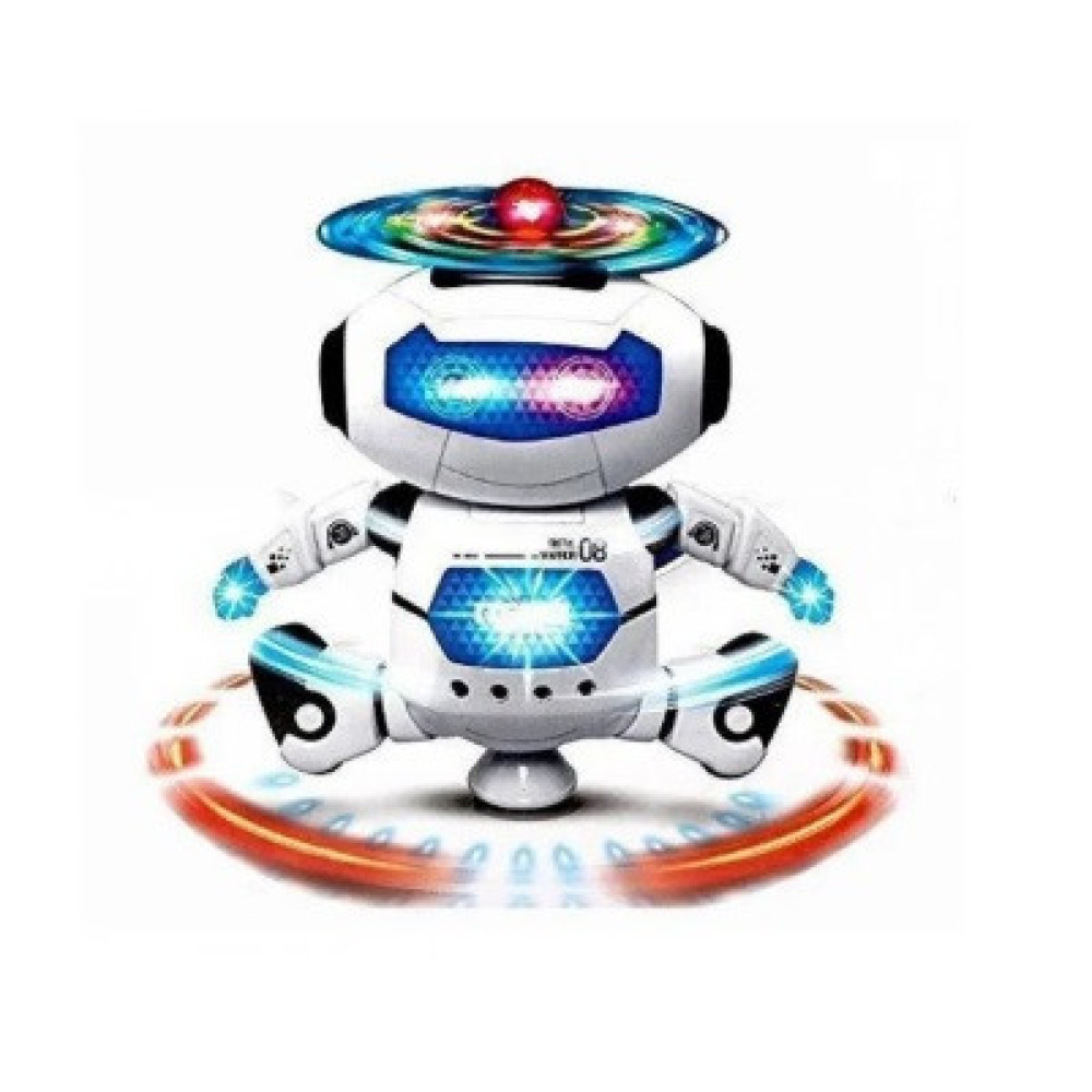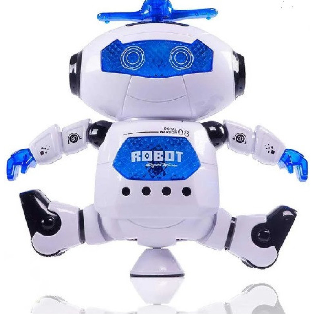 Электронный светящийся робот вращается на 360 градусов. Под забавную музыку начинает при ходьбе плавно скользить по кругу, одновременно вращаясь вокруг своей оси, двигая ручками и приседая.