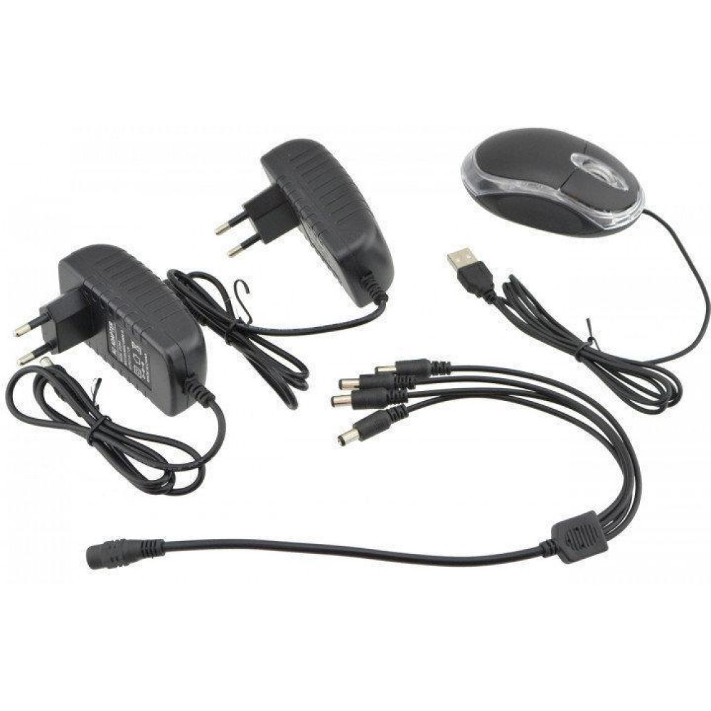 В комплектацию входят регистратор, камеры видеонаблюдения, кабели питания и передачи сигнала, разветвитель питания, блок питания для камер, блок питания для регистратора и мышка.