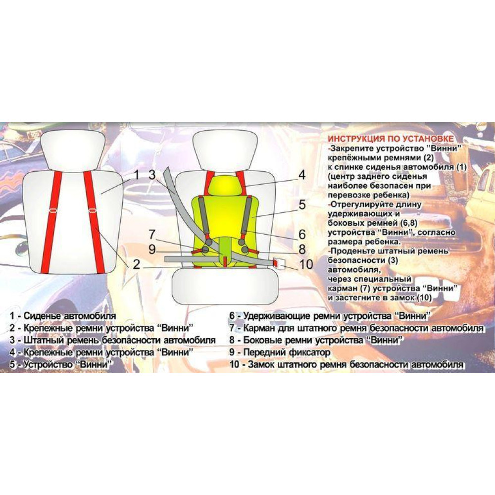- Используется совместно с ремнём безопасности автомобиля