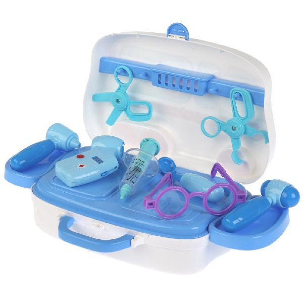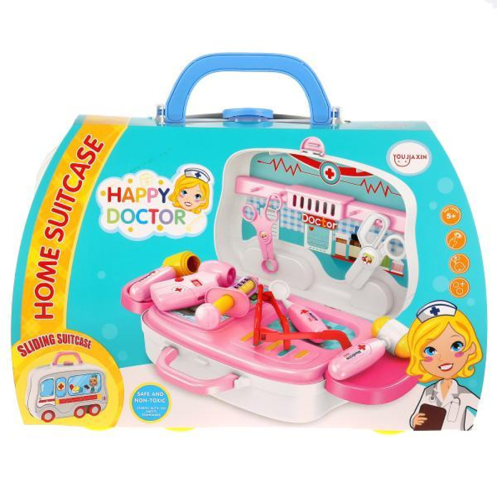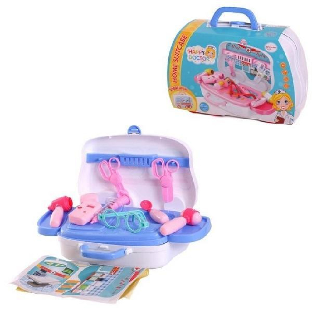 Набор доктора "Happy Doctor" - это большой познавательный комплект для малышей. Выполнен из качественного пластика, упакован в красивый кейс на колесах, который раскладывается в удобную рабочую панель для врача. Состоит из шприца, очков, офтальмологические приборы, два вида ножниц, молоточек, лопатка для осмотра горла и прочих аксессуаров