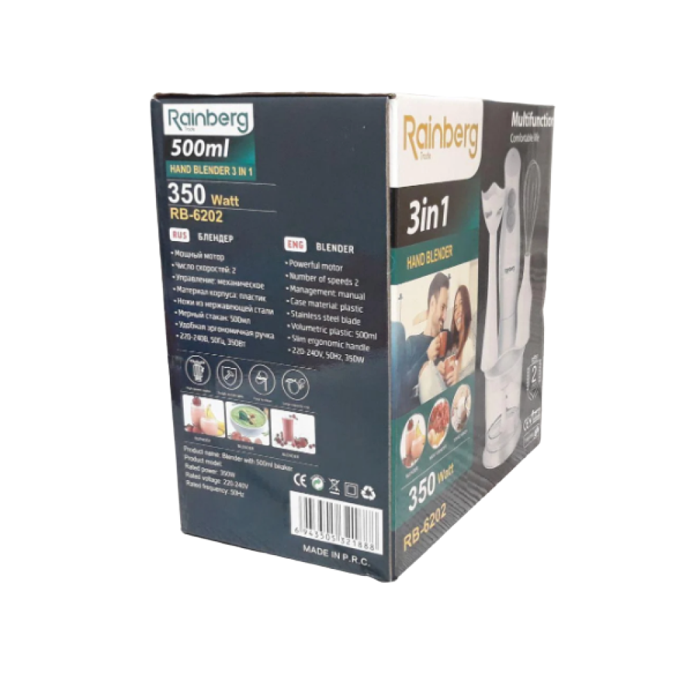 Блендер Rainberg RB 6202 3 в 1 - хороший надёжный, и что самое главное, вполне доступный, помощник на кухне для большинства современных хозяек. Ведь с его помощью можно приготовить, измельчить, перемешать до однородной массы много пищевых компонентов, начиная от детского питания и заканчивая изысканными, лёгкими и диетическими супами-пюре.