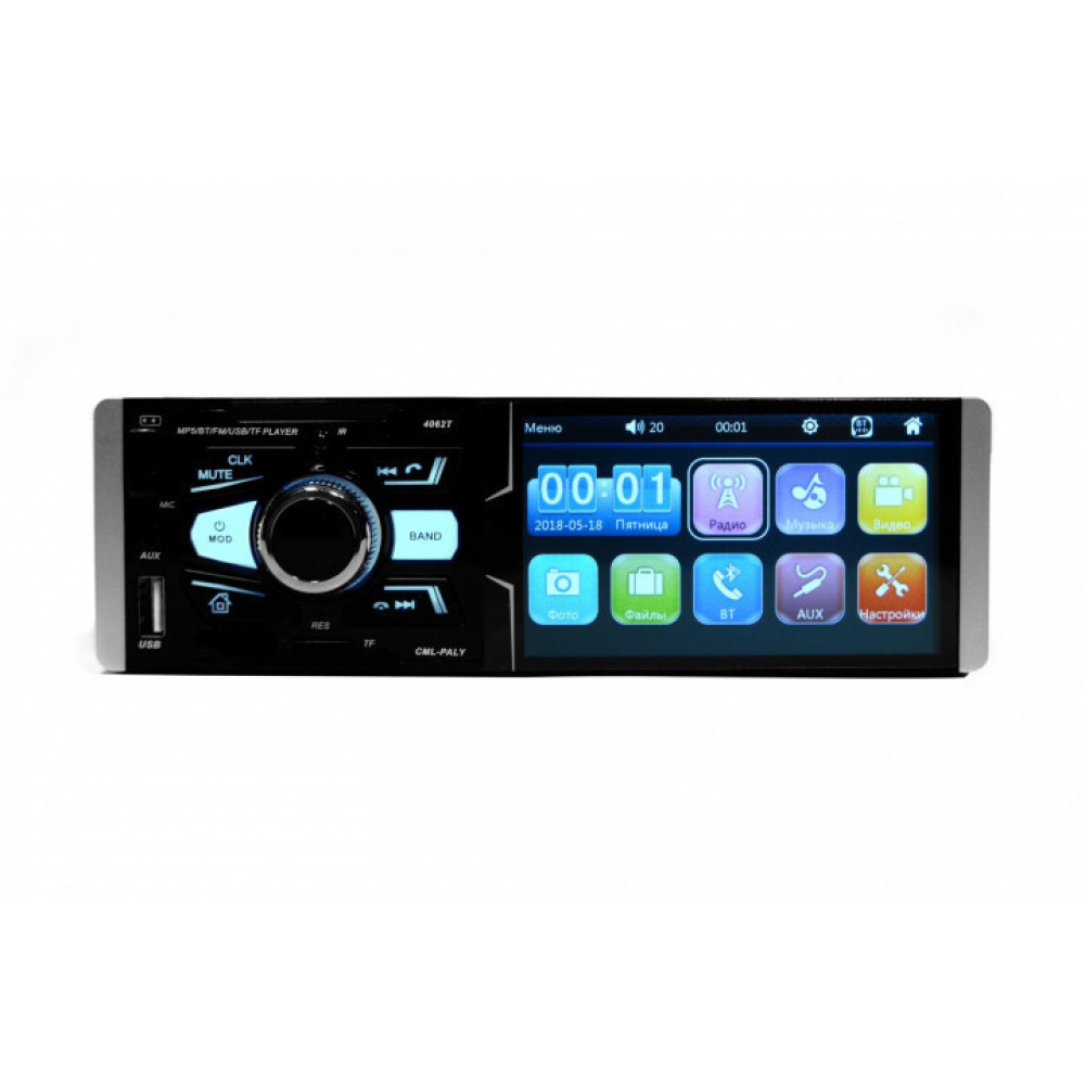 Автомагнитола 4062T с СЕНСОРНЫМ дисплеем 4.1" дюйма для просмотра видео в формате 1080P (1920x108 Pixel) и качественным экраном. Автомагнитола имеет все функции для прослушивания и просмотра качественного аудио и видео, так же в данной модели есть возможность подключения камеры заднего вида. RGB подсветка. Встроенные разъемы для 2 х USB (один для флешки, а другой для зарядки телефона. Магнитола позволит воспроизводить музыкальные композиции с носителей емкостью до 32 гигабайт.