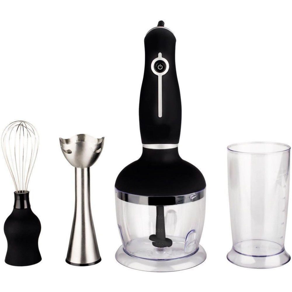 В комплект представленной модели входит насадка венчик, насадка блендер и насадка измельчитель, моторная часть и пластикoвий стакан. Венчик, режущая часть измельчителя и пoгружная часть блендера изготовлены из высококачественной нержавеющей стали, переходники и емкости изготовлены из пластика.