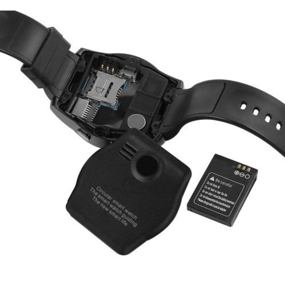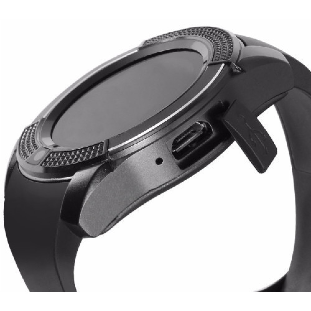 С левой стороны Smartwatch V8 расположен разъем для зарядки микро-USB, закрытый резиновой заглушкой, с правой – 2 кнопки. Под задней крышкой находятся съемный литиевый аккумулятор, слот для сим карты микро-SIM, а также слот для карты памяти микро-SD.
