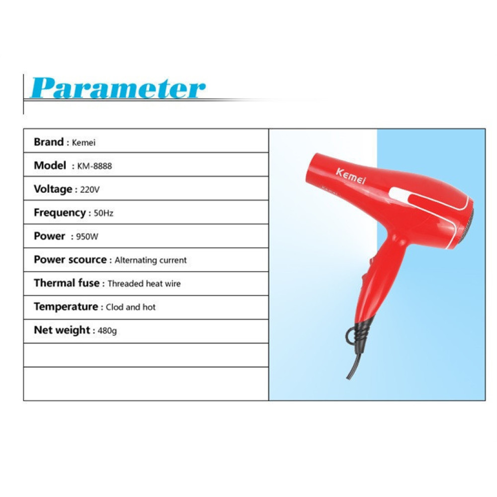 Фен для волос Kemei KM 8888, профессиональный фен для сушки волос, 950 Вт