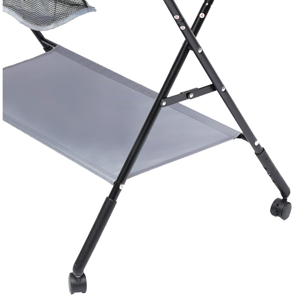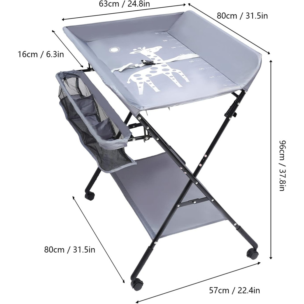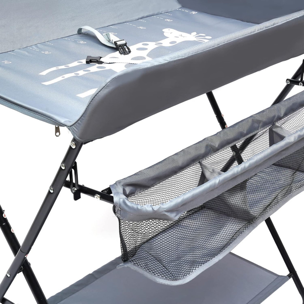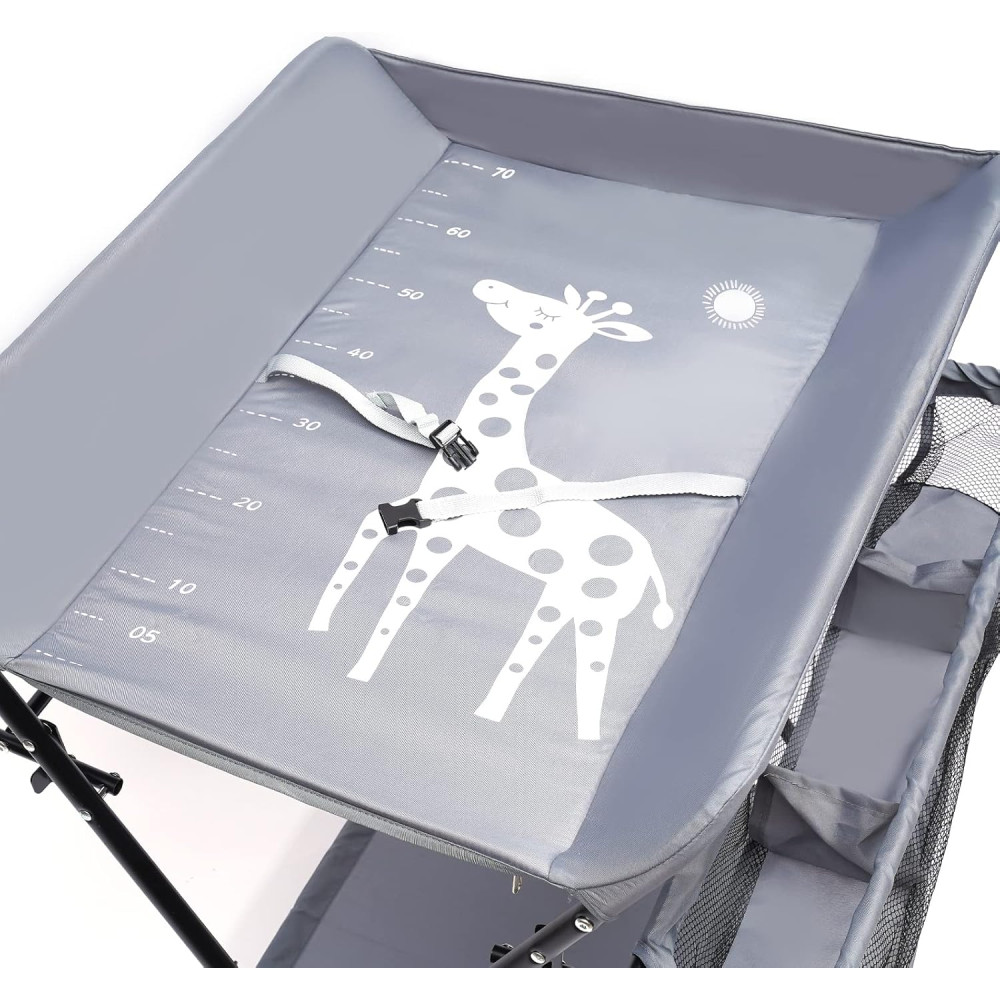 Материалы и конструкция: усиленная стальная рама, металлические упоры и плита для предотвращения деформации. Поверхность водонепроницаемая и легко моется. Удобство использования обеспечивается регулировкой высоты (92, 95, 98 см), креплениями для вешалок и органайзер-полкой. Принт в виде линейки помогает отслеживать рост малыша. Дополнительно предусмотрены страховочные пряжки, усиленный предохранительный забор и трёхпозиционная регулировка ножек