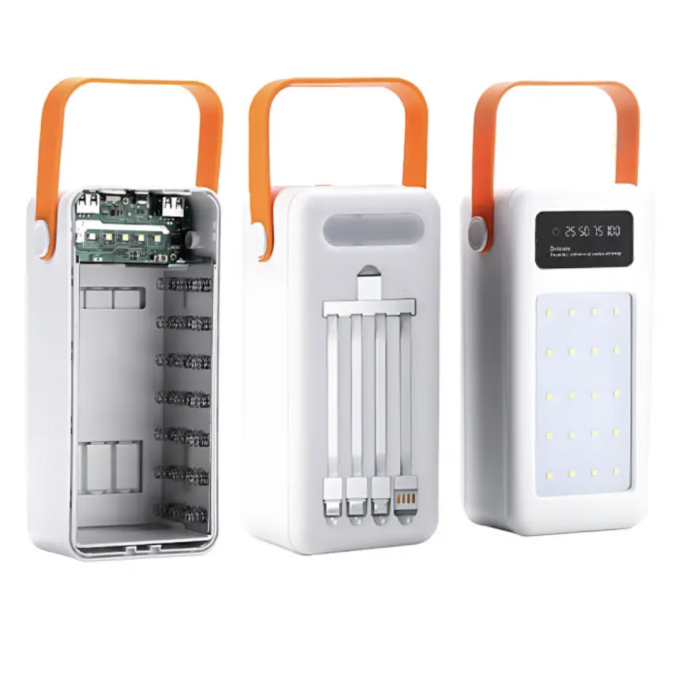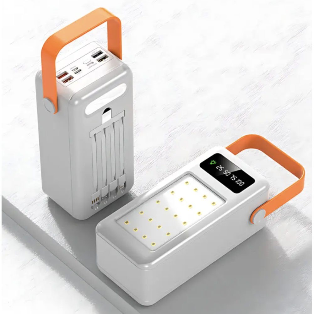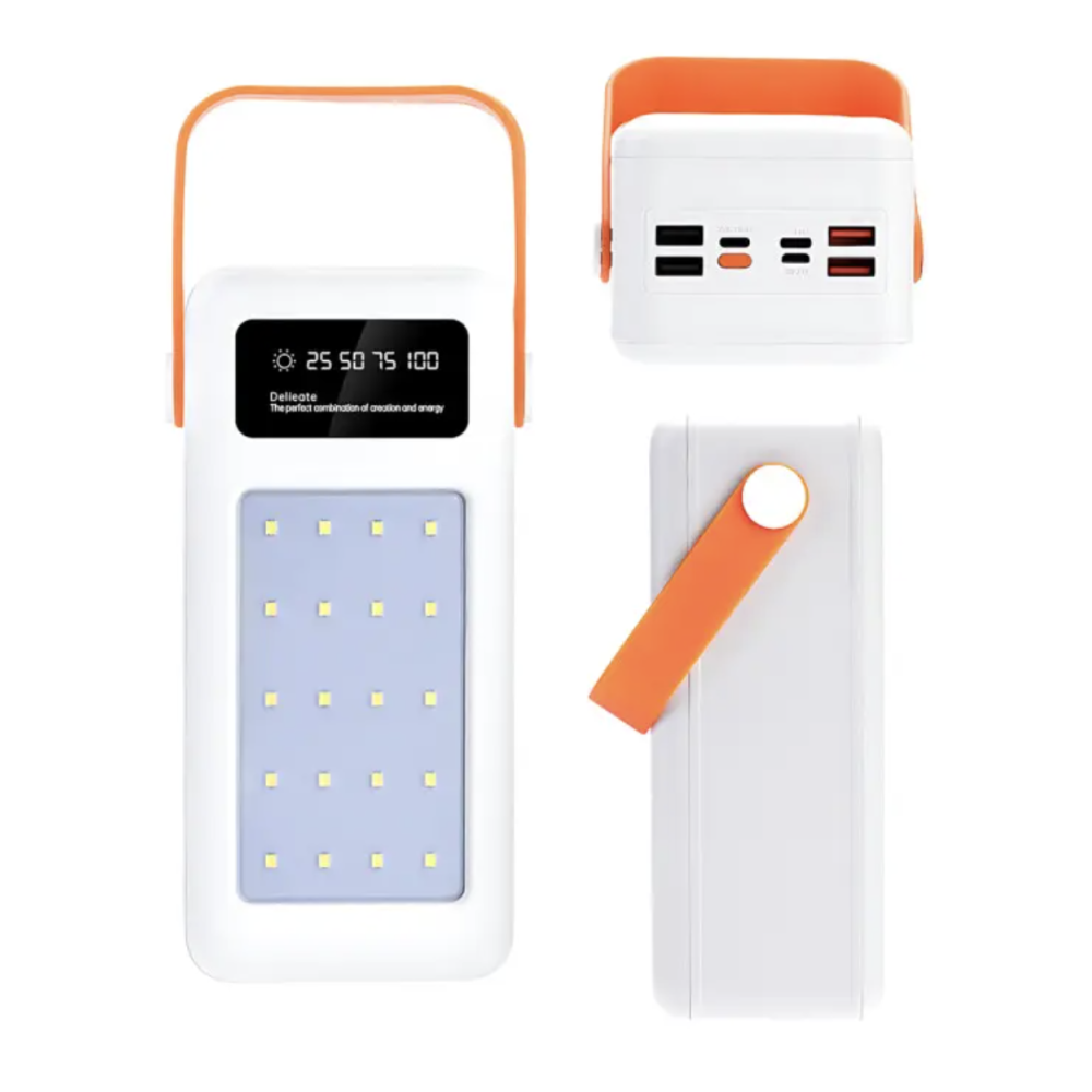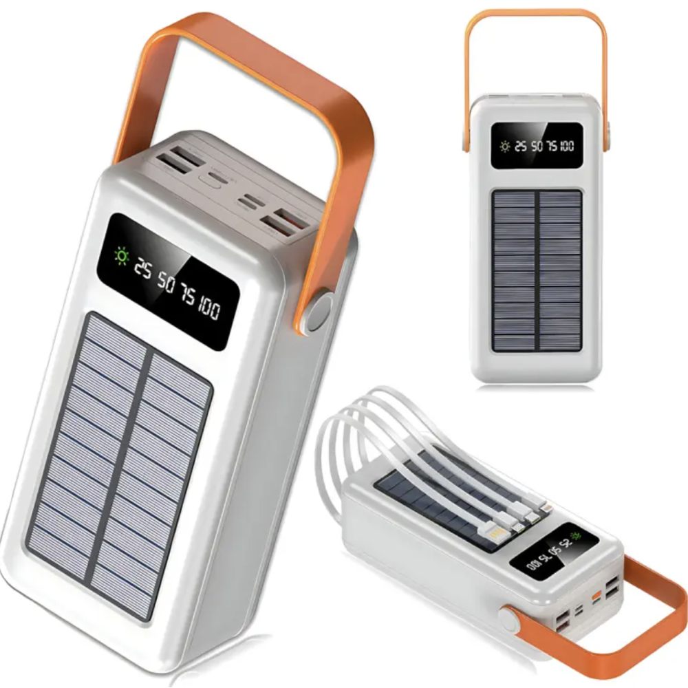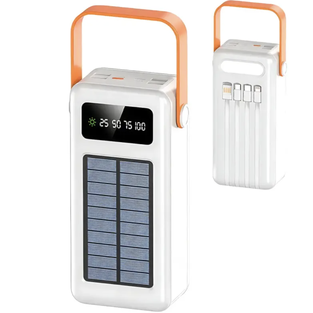 Корпус выполнен из прочного пластика, снабжён удобной ручкой для переноски и мощным LED-фонарём. Дисплей на корпусе показывает текущий уровень заряда. Солнечная панель позволяет заряжать повербанк прямо под солнечными лучами — идеальное решение для походов и выездов на природу