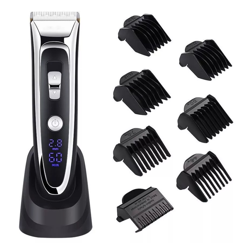 Поставляется с чистящей щеткой, гребнем, маслом для лезвий и 7 насадками.
