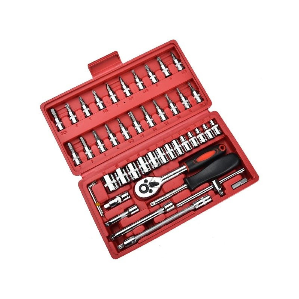 Удобный и компактный набор инструментов 46 элементов сделан из прочной хромированной стали, которая выдерживает небывалые нагрузки. Удобные пластиковые ручки на трещотке и отвертке позволяют инструментом удобно держаться в руке.