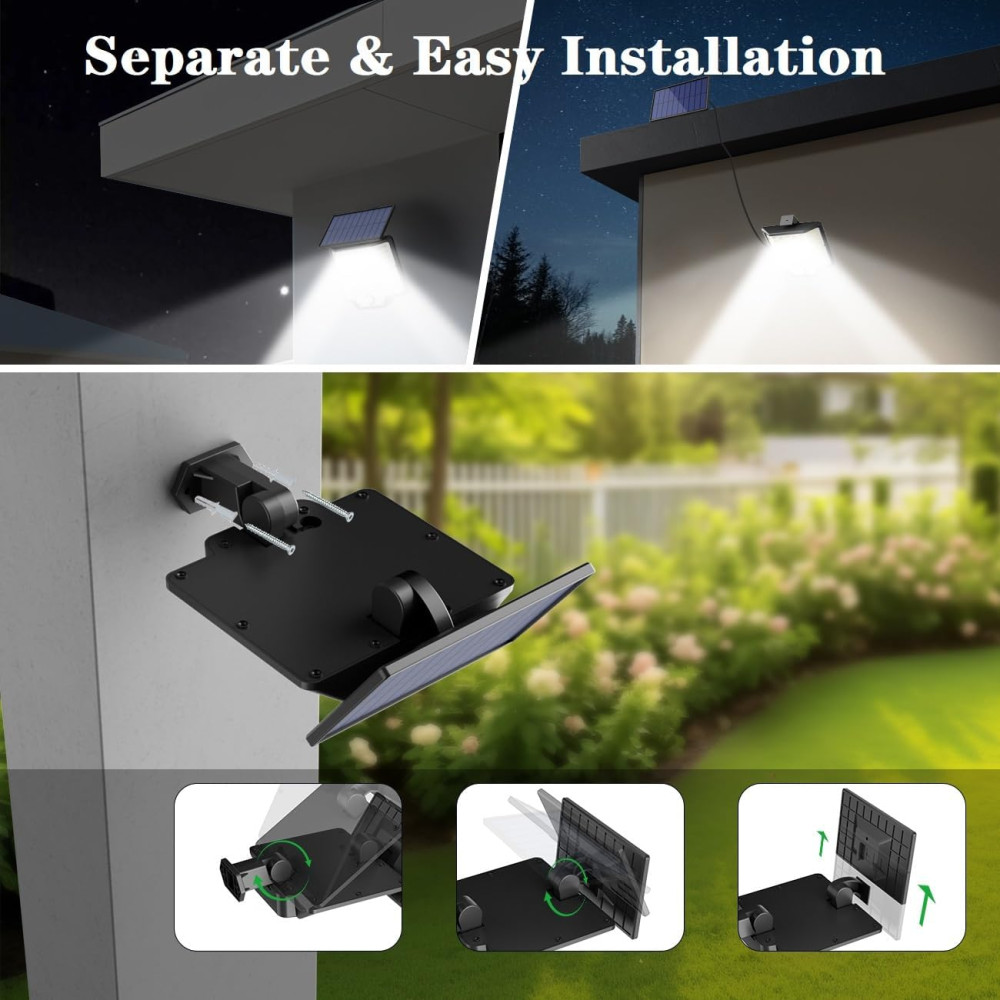 Прожектор автоматически включается при движении, равномерно освещает территорию и не требует подключения к сети — достаточно солнечного света для зарядки аккумулятора