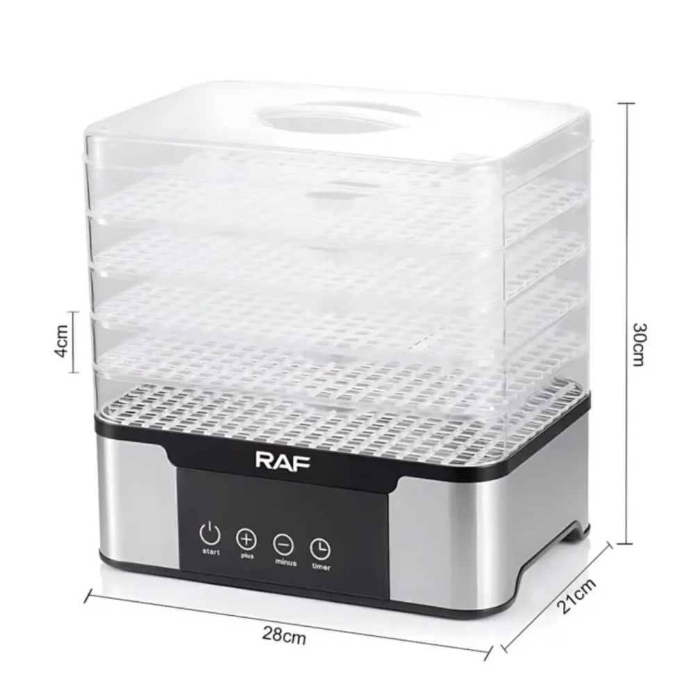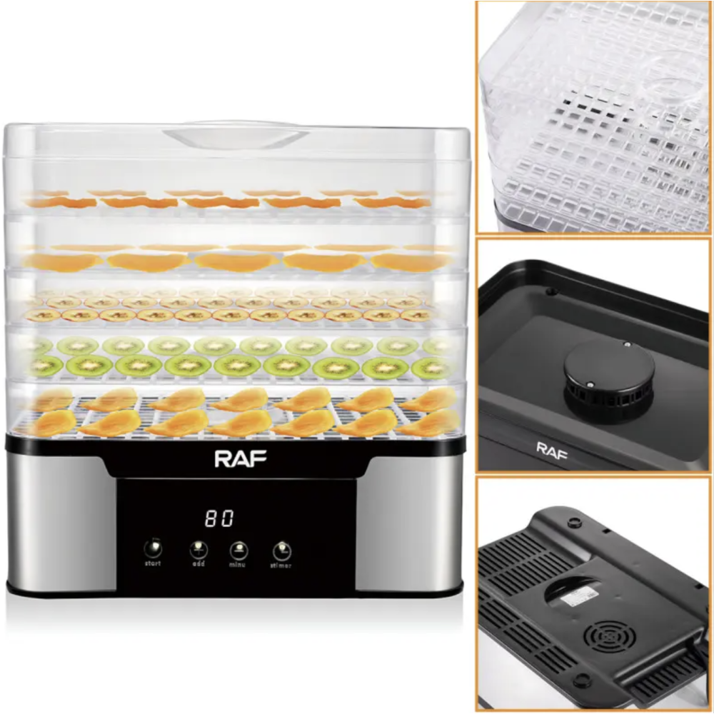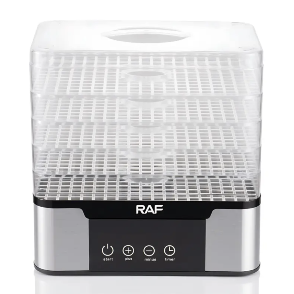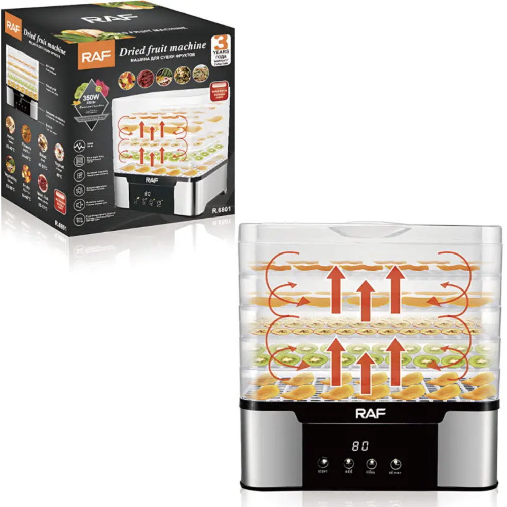 Пищевой дегидратор RAF R.6801 — это удобная и надёжная сушарка для фруктов, овощей, ягод, грибов, трав, мяса и рыбы. Благодаря мощности 350 Вт и системе конвекционного нагрева 360° продукты высушиваются равномерно на всех уровнях — без пересушенных краёв и влажной середины