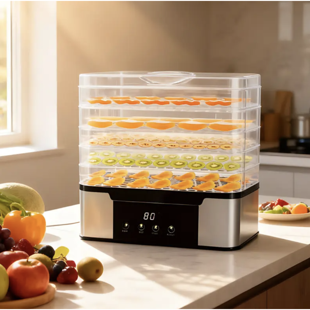 Корпус из нержавеющей стали не впитывает запахи, легко очищается и рассчитан на долгий срок службы. Тихая работа позволяет оставлять дегидратор включённым даже ночью, а простое механическое управление обеспечивает точный контроль температуры до 80°C