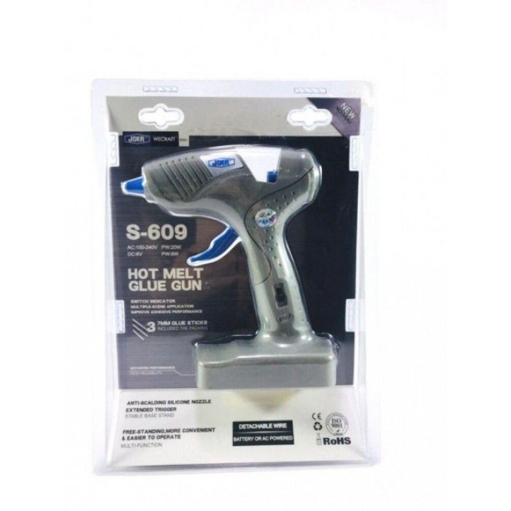 С помощью термопистолета для силиконового клея S-609 можно легко и надежно склеить самые разнообразные материалы: дерево и пластик, бумагу и картон, стекло и керамику, и многое другое. Пистолет для силиконового клея S 609 работает как от сети 220v так и от 4 батареек AA. Подойдет для рукоделия и мелкого ремонта. Работа от батареек позволяет использовать пистолет практически в любых условиях, где нет возможности подключиться к электросети.