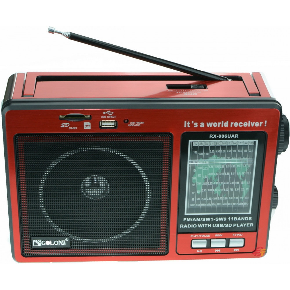 Радиоприемник GOLON RX-006UAR с превосходым качеством приема. Благодаря мощному встроенному аккумулятору (до 12 часов), вы сможете слушать любимую музыку c USB флешки, карты памяти SD, очень мощный FM приемник (на гетеродинной схеме), превосходное качество приема, даже в отдаленных местах, корпус из пластика, есть ручка для переноса, легко носить с собой, 3 варианта питания: встроенный аккумулятор (до 12 часов), батарейки mars 4шт, от сети 220В (шнур в комплекте), от него же и заряжается встроенный аккумулятор.
