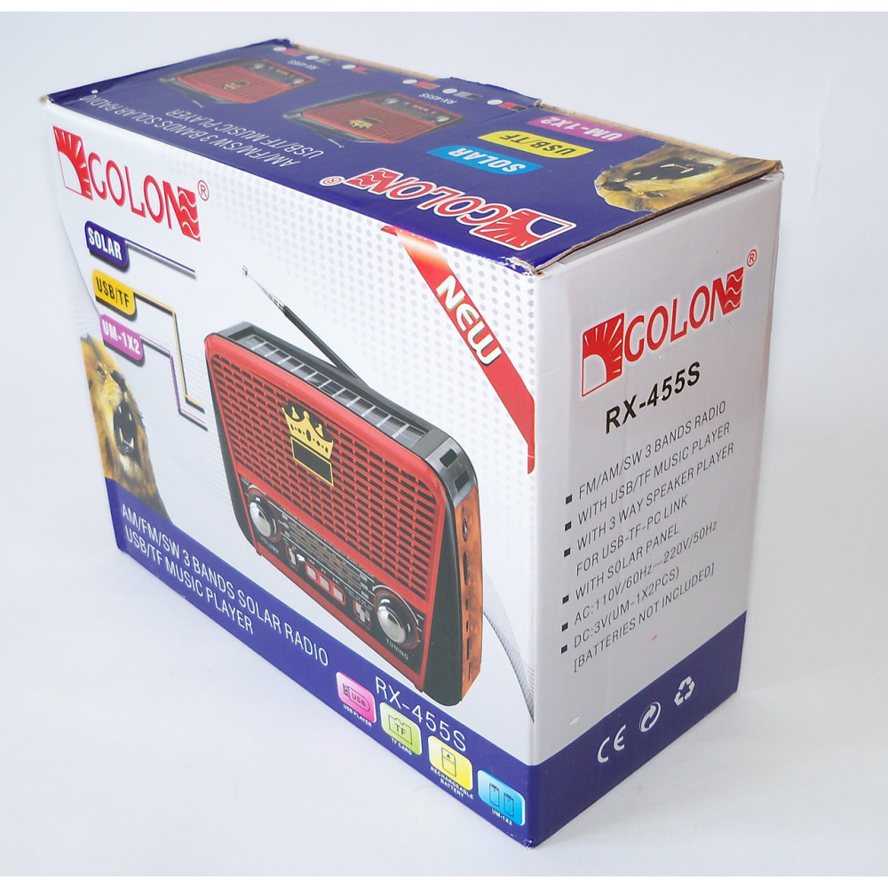 Радиоприёмник Golon RX-455S ― это отличный выбор для дома и дачи! Радио RX455S принимает трансляции радиостанций в FM, AM, SW (УКВ,СВ, КВ) диапазонах. Радиоприёмник имеет солнечную батарею для зарядки встроенного аккумулятора, яркий LED фонарик.