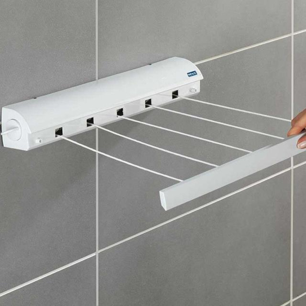 Раздвижная автоматическая сушилка для белья · Вытяжная настенная роликовая бельевая веревка имеет пластиковый корпус, внутри которого на штангу намотаны четыре веревки, каждая длиной до 3.2 метра. Веревки вытягиваются из корпуса за планку, к которой они крепятся и их можно зафиксировать на любой вытянутой длине. Корпус вешалки крепиться на стену, а на противоположной стене устанавливаются два крючка, за которые зацепляется планка с веревками. Высушив белье, вы можете снять планку с крючков и автоматическим механизмом смотать веревки в корпус.