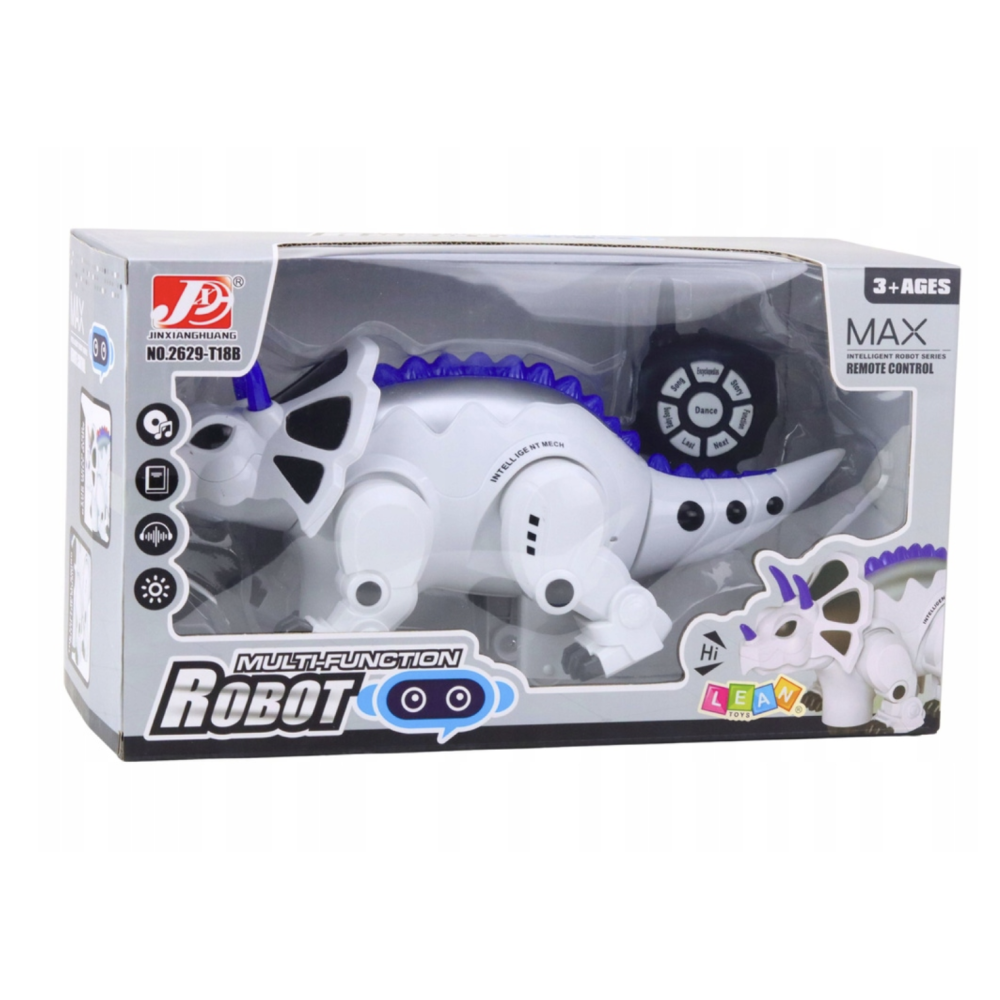 Большой радиоуправляемый интерактивный динозавр 2629-T18B — это игрушка с естественными движениями и множеством функций. Робозавр может двигаться во всех направлениях, махать головой, вилять хвостом и выражать эмоции с помощью интерактивных глаз. Игрушка управляется как с пульта, так и автономно, используя сенсоры и гироскоп для ориентации в пространстве, что делает её отличным подарком для ребёнка