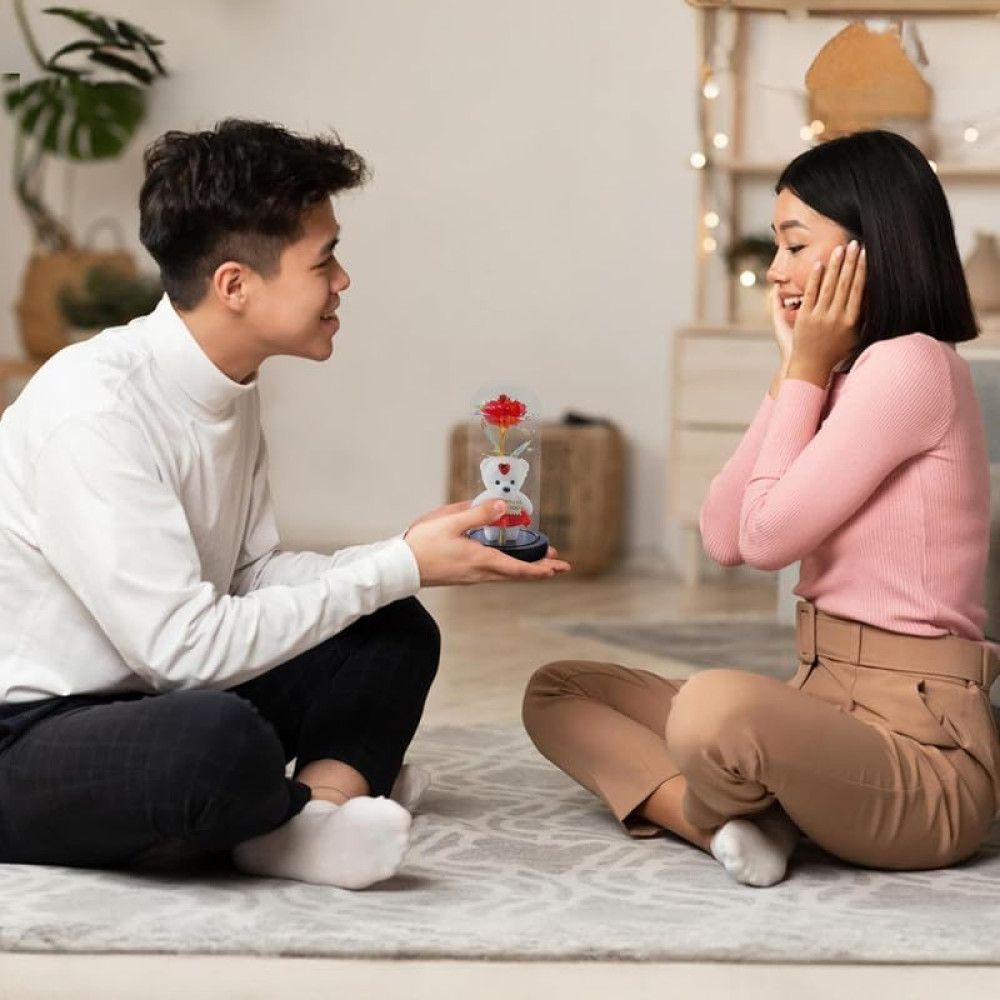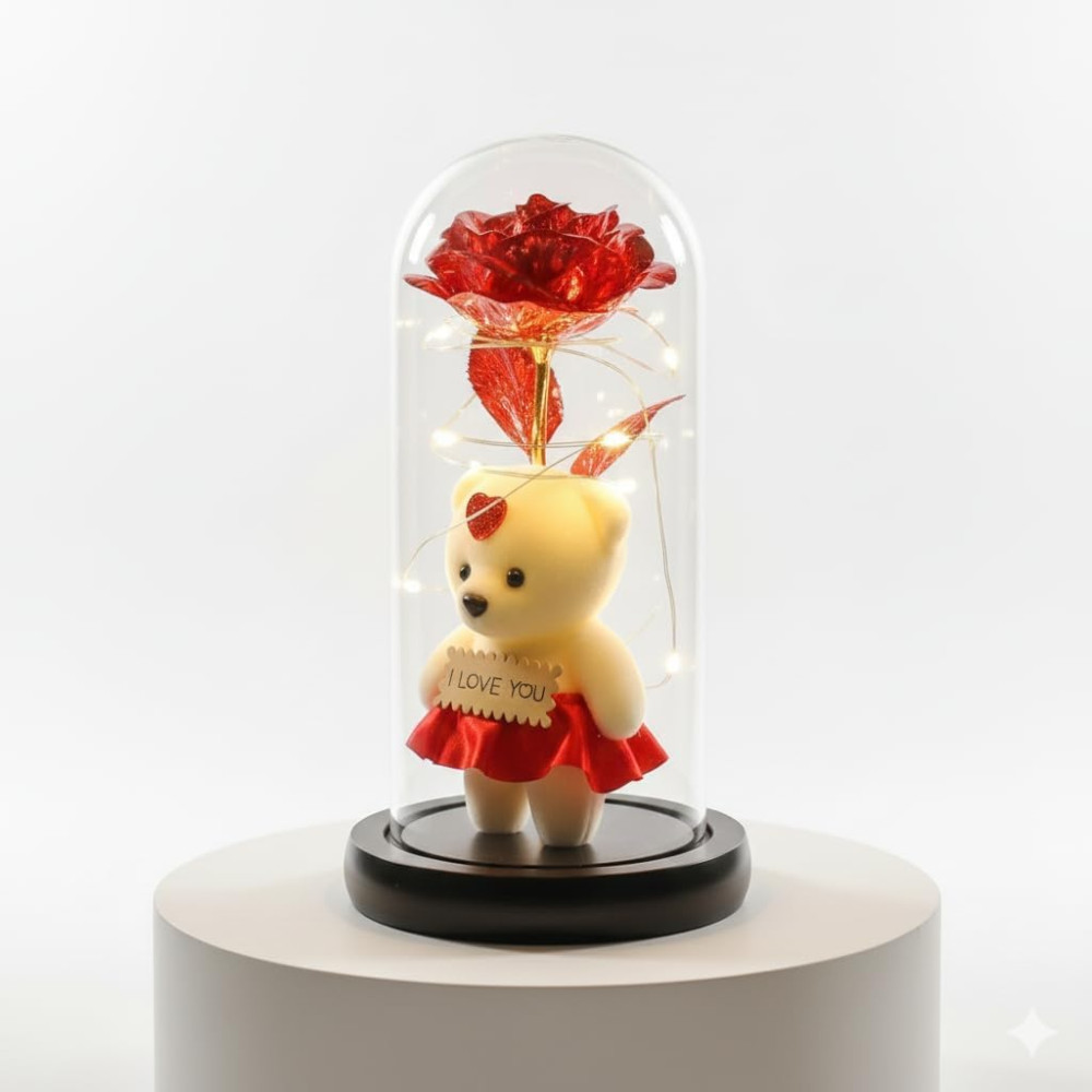 Роза в стеклянной колбе Rose of Love с LED-подсветкой и плюшевым мишкой ∙ Декоративная хрустальная роза с мишкой и сердцем I Love You