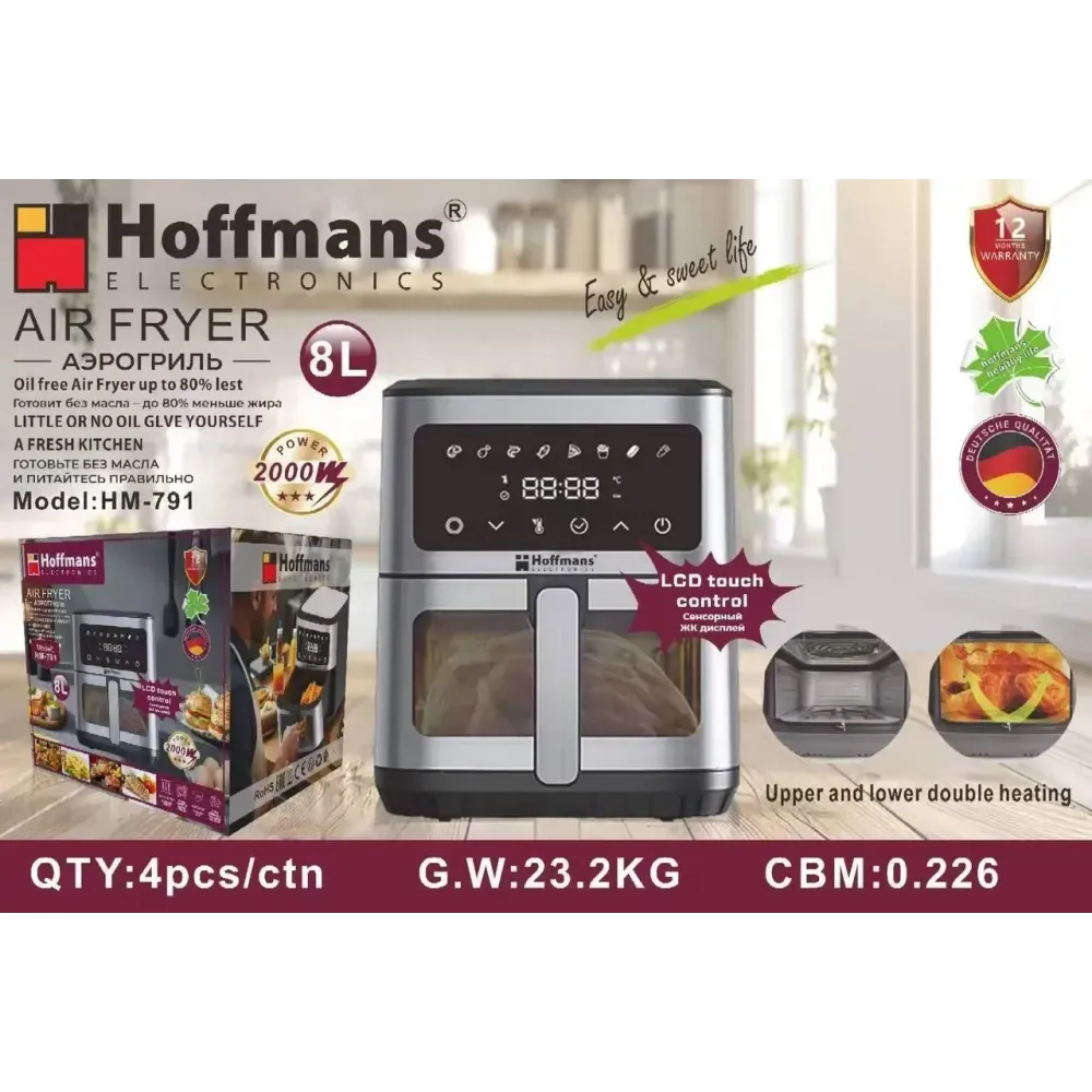 Аэрофритюрница Hoffmans HM-791 – это современный и многофункциональный кухонный прибор, который позволяет готовить вкусные и полезные блюда с минимальным количеством масла. Объём чаши 8 литров делает её идеальной как для семьи, так и для приготовления угощений для гостей. Мощность 2000 Вт и система двойного нагрева (верхний и нижний нагревательные элементы) обеспечивают равномерное прожаривание и ускоряют процесс приготовления.