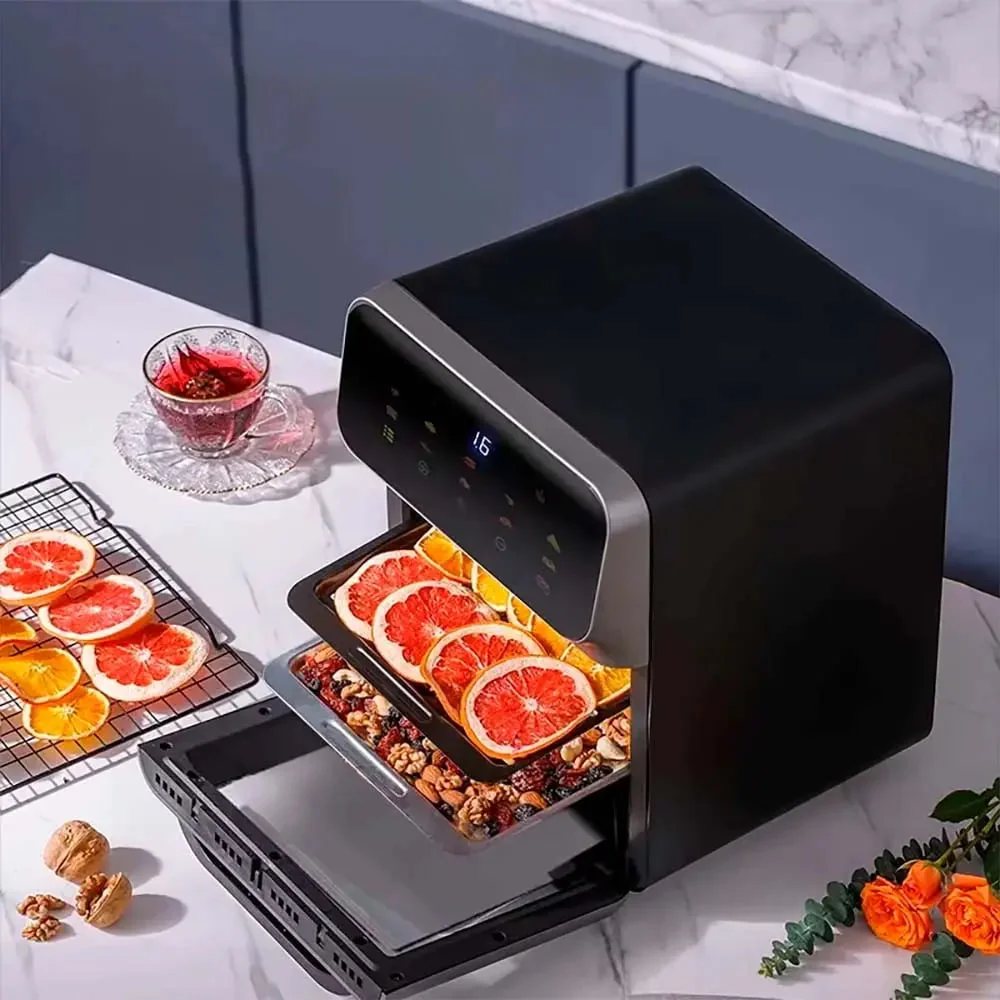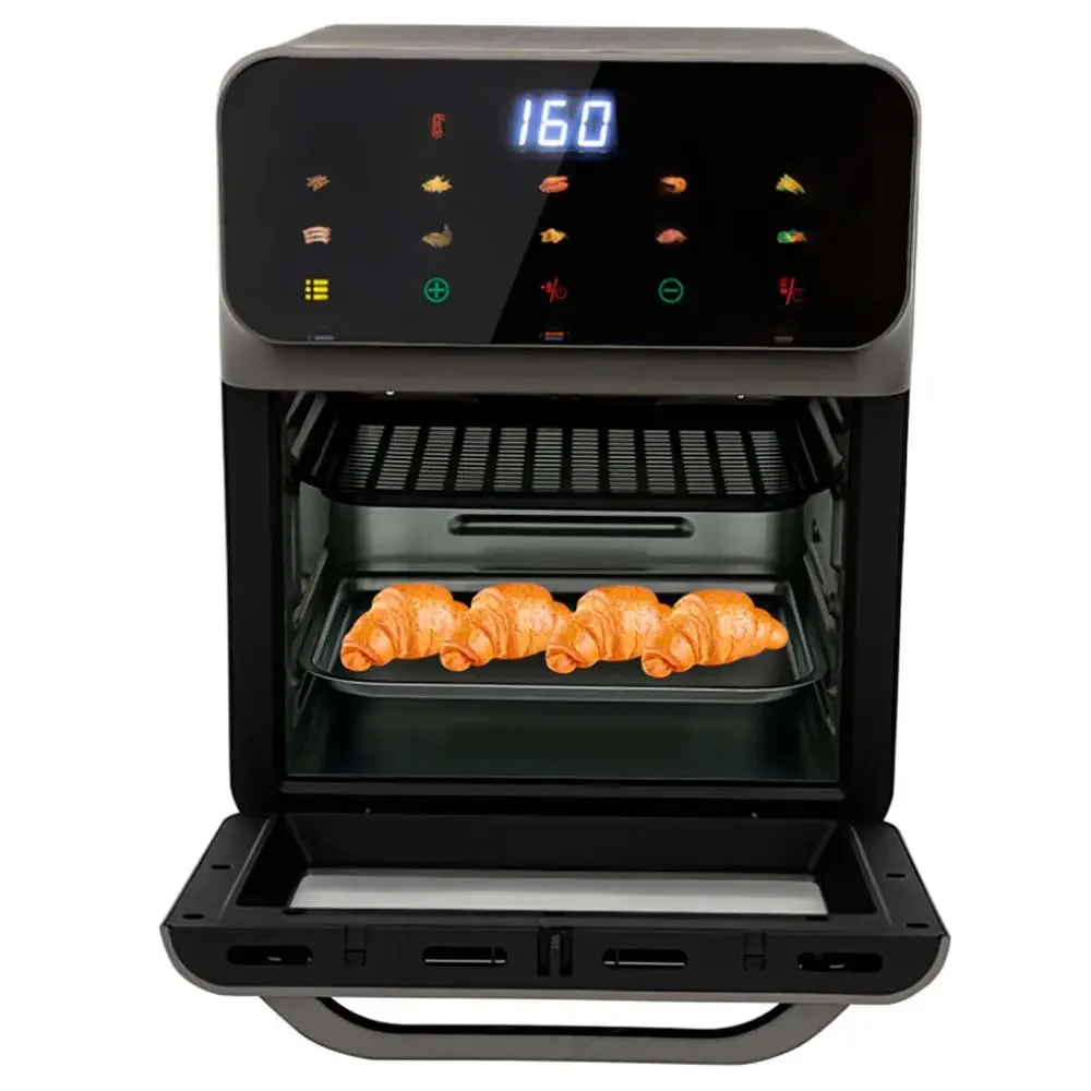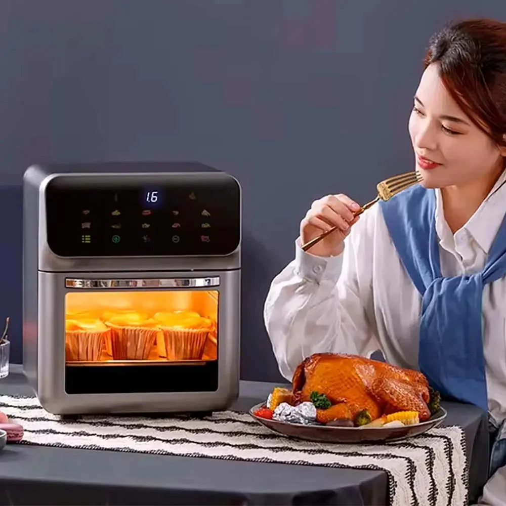 Благодаря вместительному объёму 15 литров, аэрогриль идеально подходит для приготовления целой курицы, крупного куска мяса, рыбы или овощей. Устройство сочетает функции жарки, запекания и гриля, позволяя легко готовить разнообразные блюда для всей семьи. Стильный черный корпус и простое управление делают аэрогриль не только функциональным, но и элегантным дополнением любой кухни.