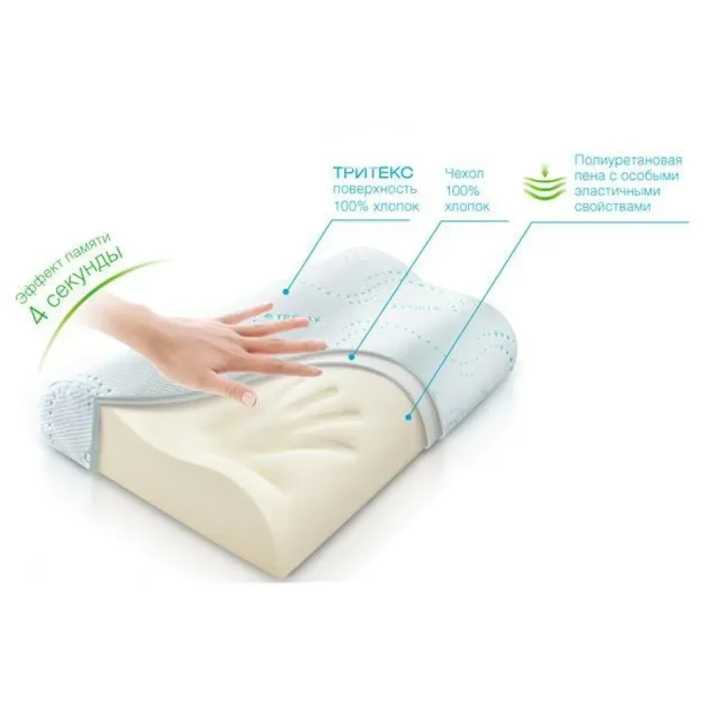 Ортопедическая подушка Memory Pilllow интересна тем, что «запоминает» анатомические особенности владельца. Благодаря специальному наполнителю – «мемориформ», реагирующему на температуру тела и давление, происходит поддержка шеи и позвоночника.