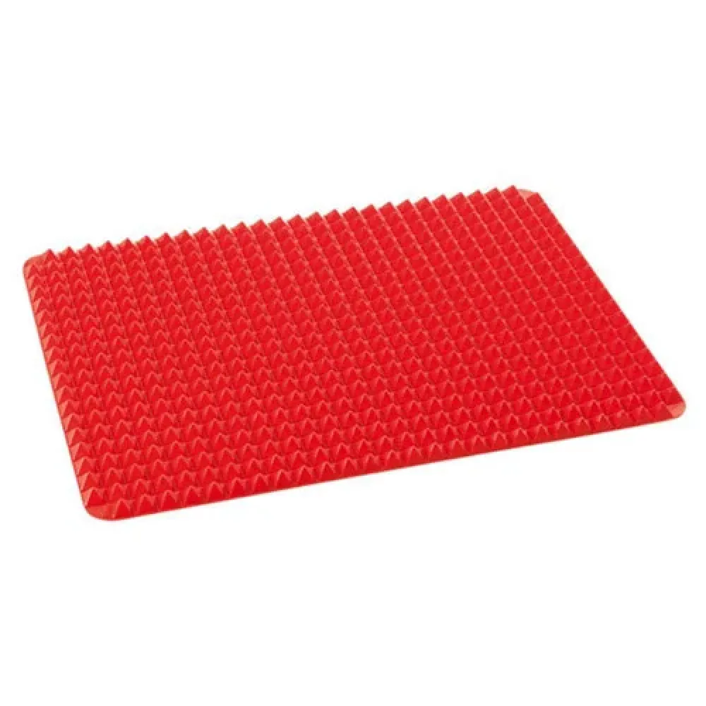 Антипригарный силиконовый коврик – противень для гриля и выпечки + Подставка под горячее Pyramid Pan Cooking Mat может служить как противнем для запекания, так и возможно использование в качестве кондитерской форме. В случае противня позволит равномерно и удобно запекать любимые блюда, а продукты готовки, лежащие на вершинах пирамидок, не контактируют непосредственно с противнем и имеют улучшенную циркуляцию горячего воздуха. Пирамидки достаточно упругие и не прогибаются под тяжестью продуктов.