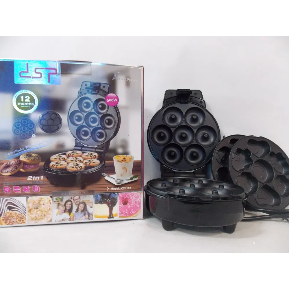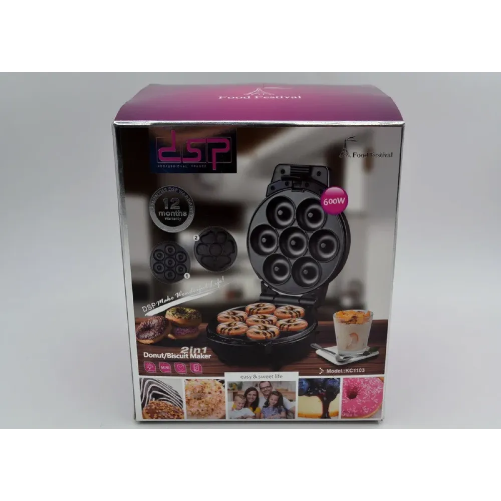 Аппарат DSP KC1103 2 в 1 для изготовления бисквитов и пончиков, имеет антипригарное покрытие, и может приготовить 7 пончиков, за довольно короткое время.