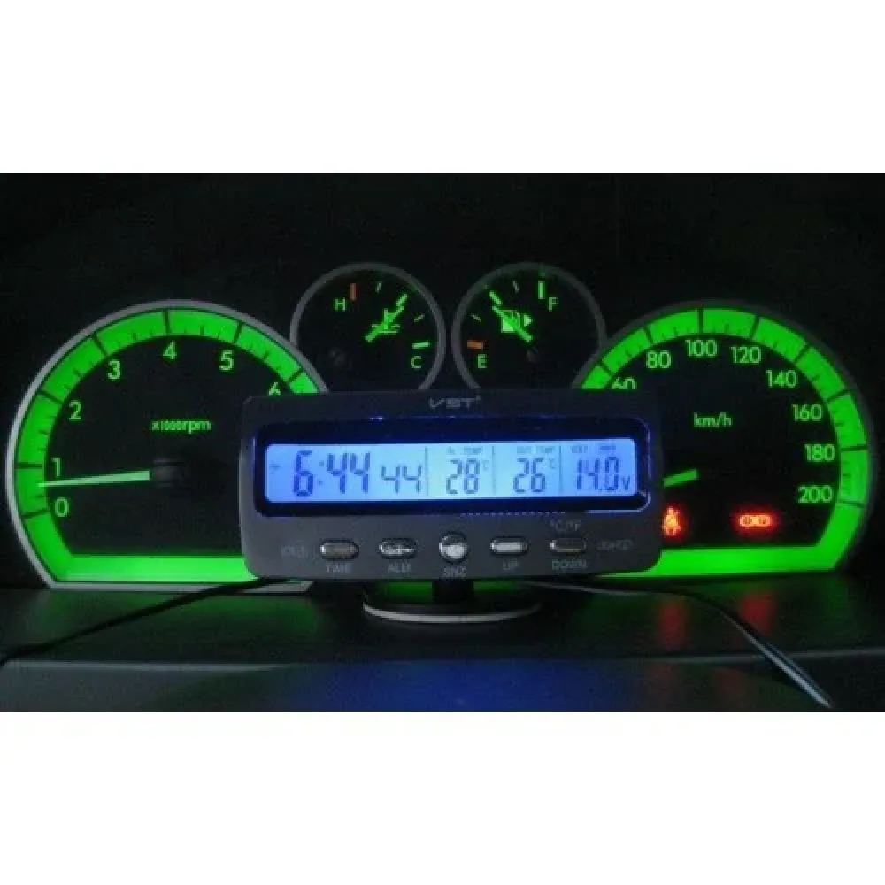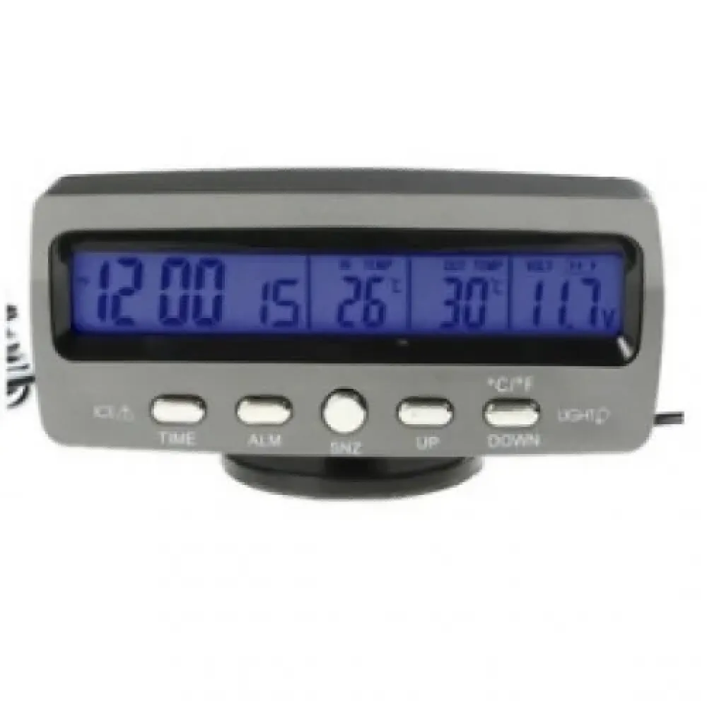 Описание функций 1. Дата, время (12 и 24 часовой режим) и день недели. 2. Будильник. 3. Функция SNOOZE (соня) с продолжительностью 5 мин. 4. Датчик внутренней и наружной температуры (Цельсий, Фаренгейт). 5. Предел термометра: -50°С до +70°С. 6. Погрешность термометра: 1.0°С. 7. Термометр обновляет данные через каждые 20 сек. 8. LED подсветка синего цвета. 9. Рабочее напряжение: 12.0V. 10. Длинна провода датчика наружной температуры 3м. 11. Размеры: 113-49-63мм.