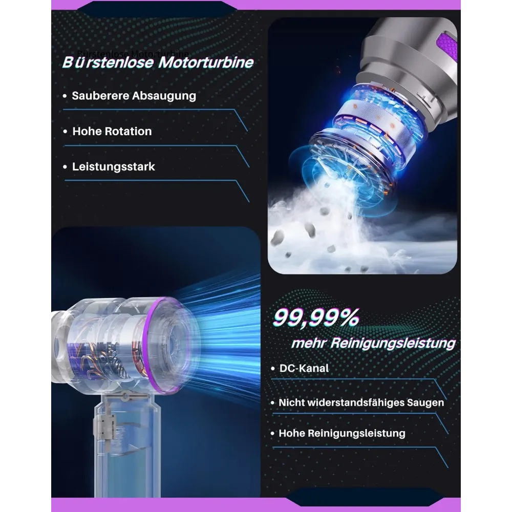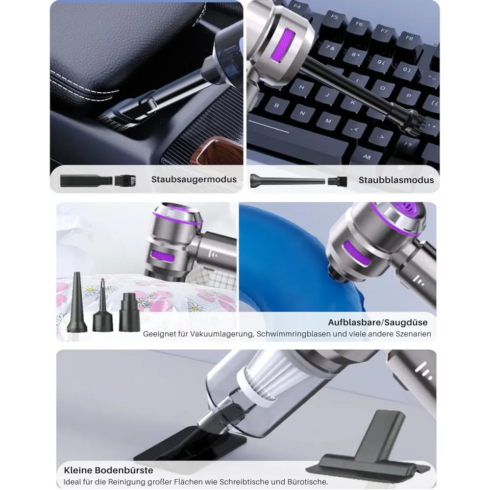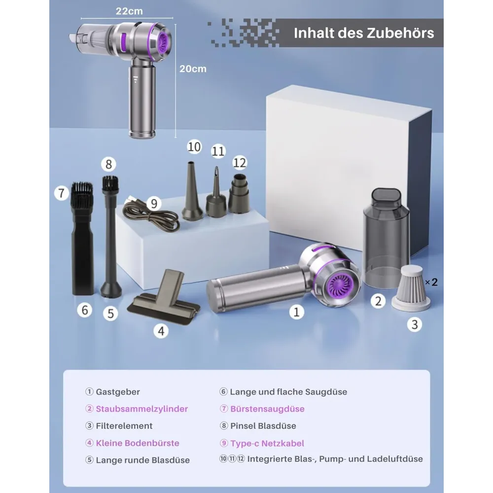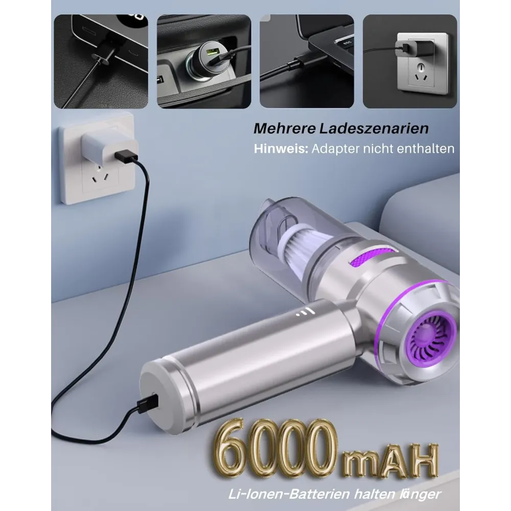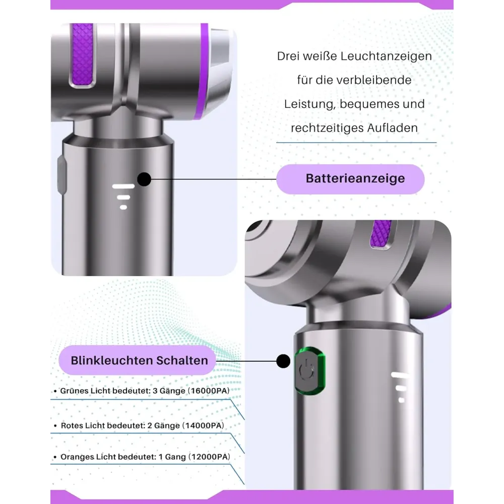 Оснащён мощным мотором 100 Вт с оборотами до 8000 об/мин, аккумулятором 2000 mAh, обеспечивающим до 30 минут автономной работы. Быстрая зарядка через USB Type-C, низкий уровень шума ≤70 дБ и температурная устойчивость от -20°C до +50°C делают использование удобным и безопасным.