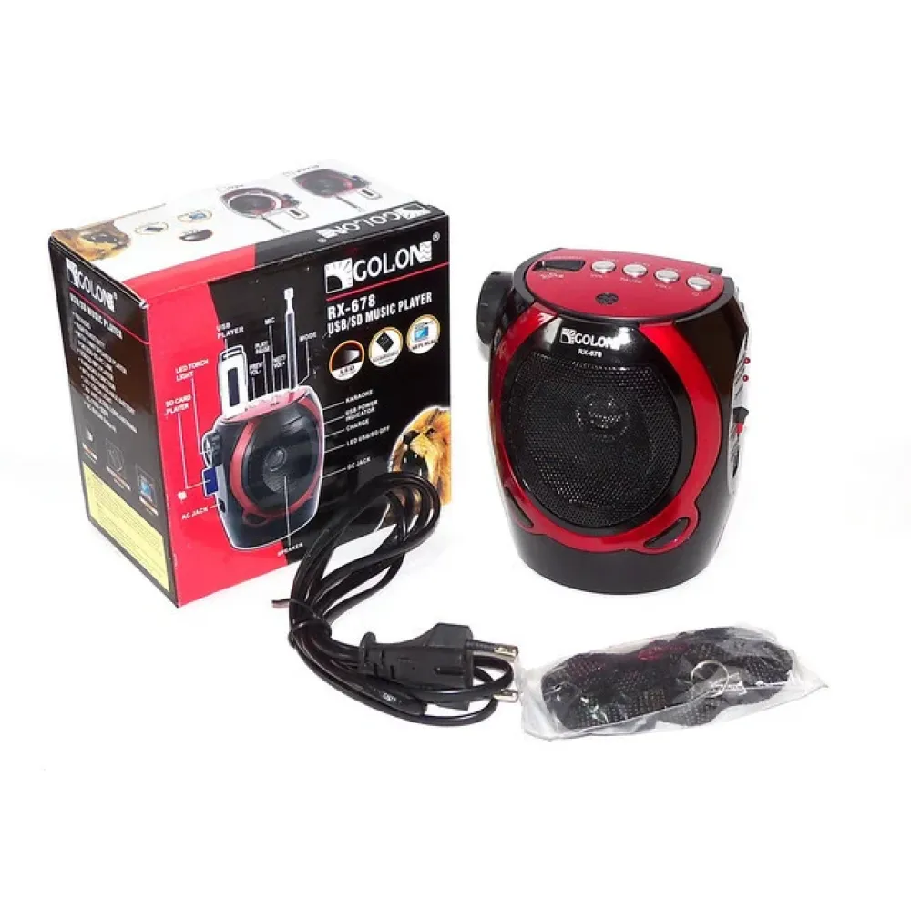 На верхней панели Golon RX-678 находятся многофункциональные кнопки управления воспроизведения, переключатели для выбора функции между USB/SD или радио, а также кнопки переключения радиоканалов, а еще с их помощью можно переключить трек или поставить плеер на паузу и отрегулировать уровень громкости. По бокам находятся разъемы для подключения кабелей зарядки и разъем для подключения микрофона, что позволяет петь караоке.