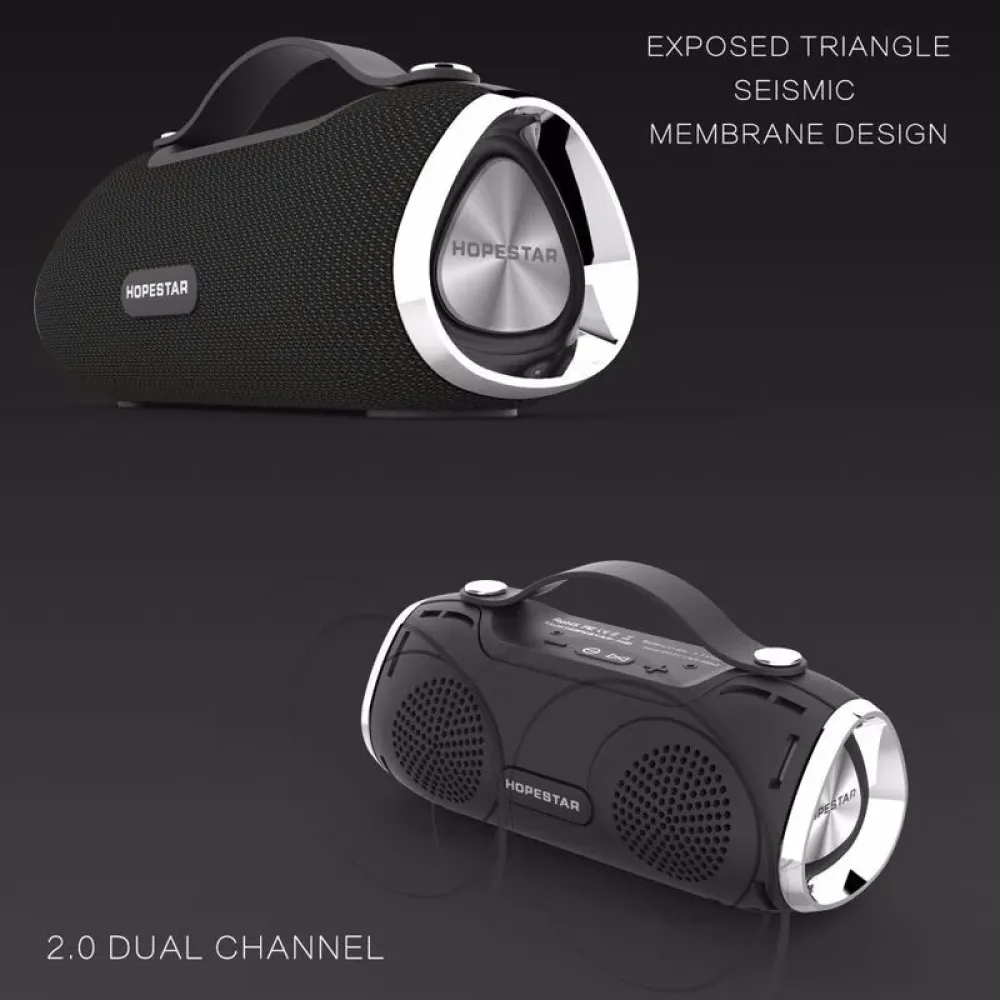 Портативная акустическая стерео колонка Hopestar H40 - это оригинальная брендовая Bluetooth колонка с стильным современным дизайном, в пыле-влагозащищенном корпусе и с великолепным насыщенным звуком. В колонке разместилось 2 динамика размером 57 мм по 5 Вт, которые выдают отличный звук для довольно компактных размеров колонки. По бокам колонки расположены подвижные низкочастотные мембраны с лого HOPESTAR, и как у модных сейчас колонкок от JBL, выглядят эффектно и впечатляюще, визуально подчеркивая глубину звучащих басов. Звучит Hopestar H40 громко и чисто, все частоты сбалансированы, нет запирания баса или середины, пронзительных высоких нот, музыка всех стилей звучит максимально натурально.
