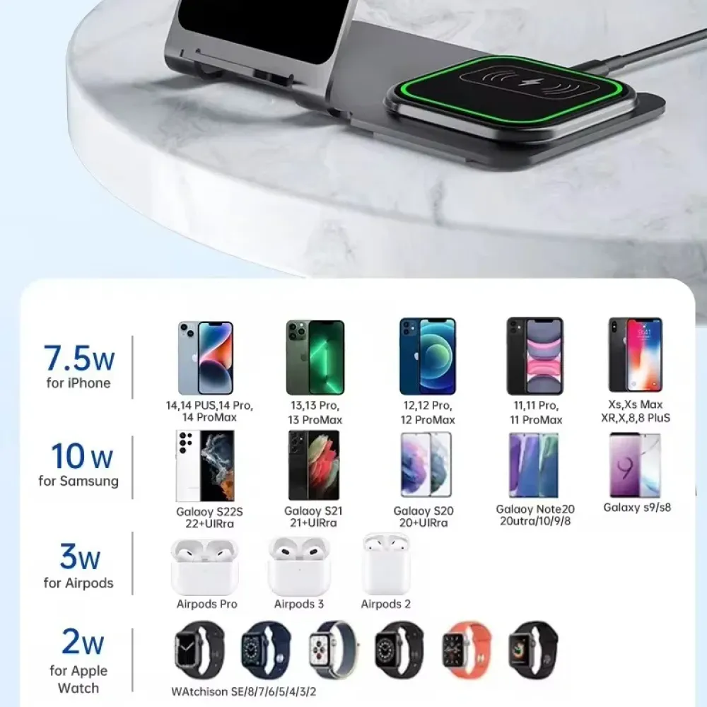Откройте для себя удобство и эффективность с беспроводной зарядной станцией 3 в 1, которая сочетает в себе магнитный держатель-подставку мощностью 15 Вт и зарядное устройство для телефона, часов и наушников. Эта инновационная станция позволяет вам одновременно заряжать iPhone, Apple Watch и AirPods в одном месте, избавляя вас от необходимости иметь несколько разных зарядных устройств. Изготовленная из высококачественного пластика, станция остается прохладной даже после продолжительного использования, обеспечивая надежность и безопасность.