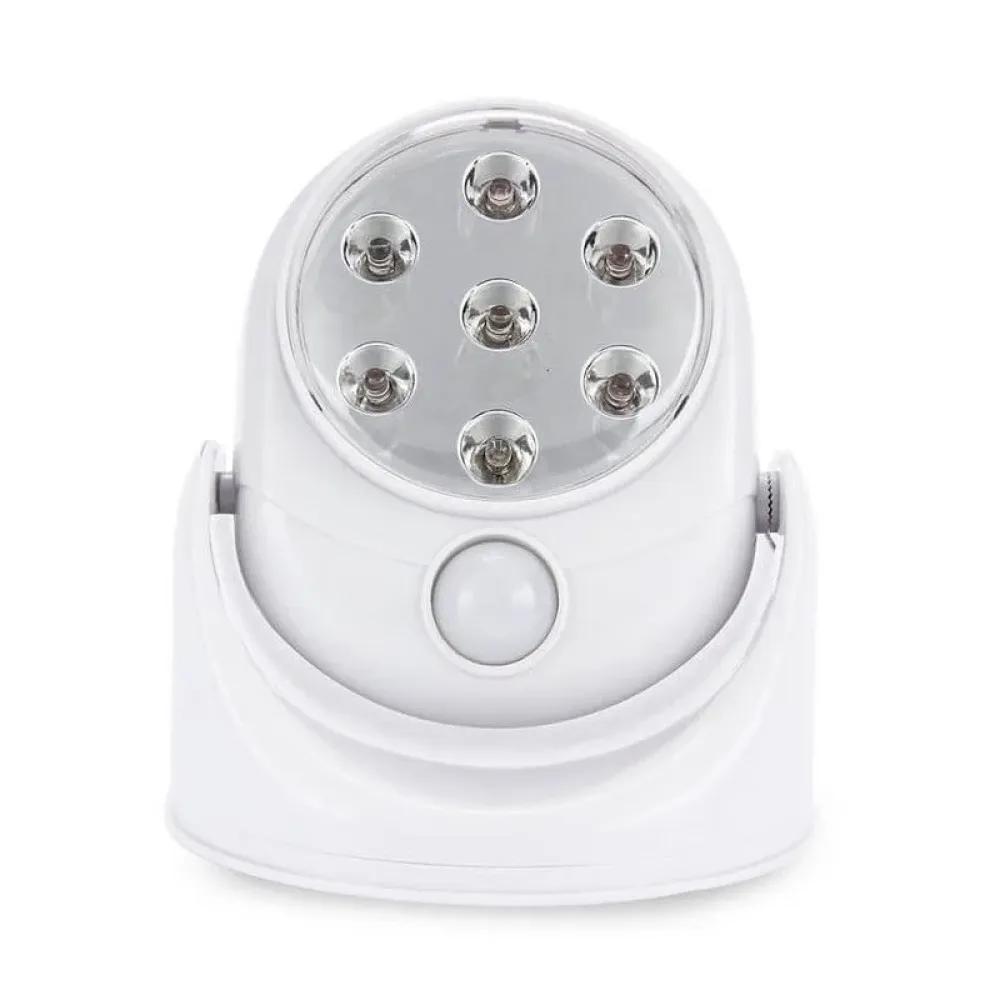 Светильник состоит из 7 крупных светодиодов, работает от 4 батареек типа АА и может использоваться практически в любом месте: Он способен крутиться вверх и вниз на 360 градусов, абсолютно в любую сторону. Его можно прикрепить на потолок, на стену, на лестницу, вмонтировать в шкаф, положить на тумбочку возле кровати, в конце концов, поместить в холодильник, если у Вас не работает лампочка