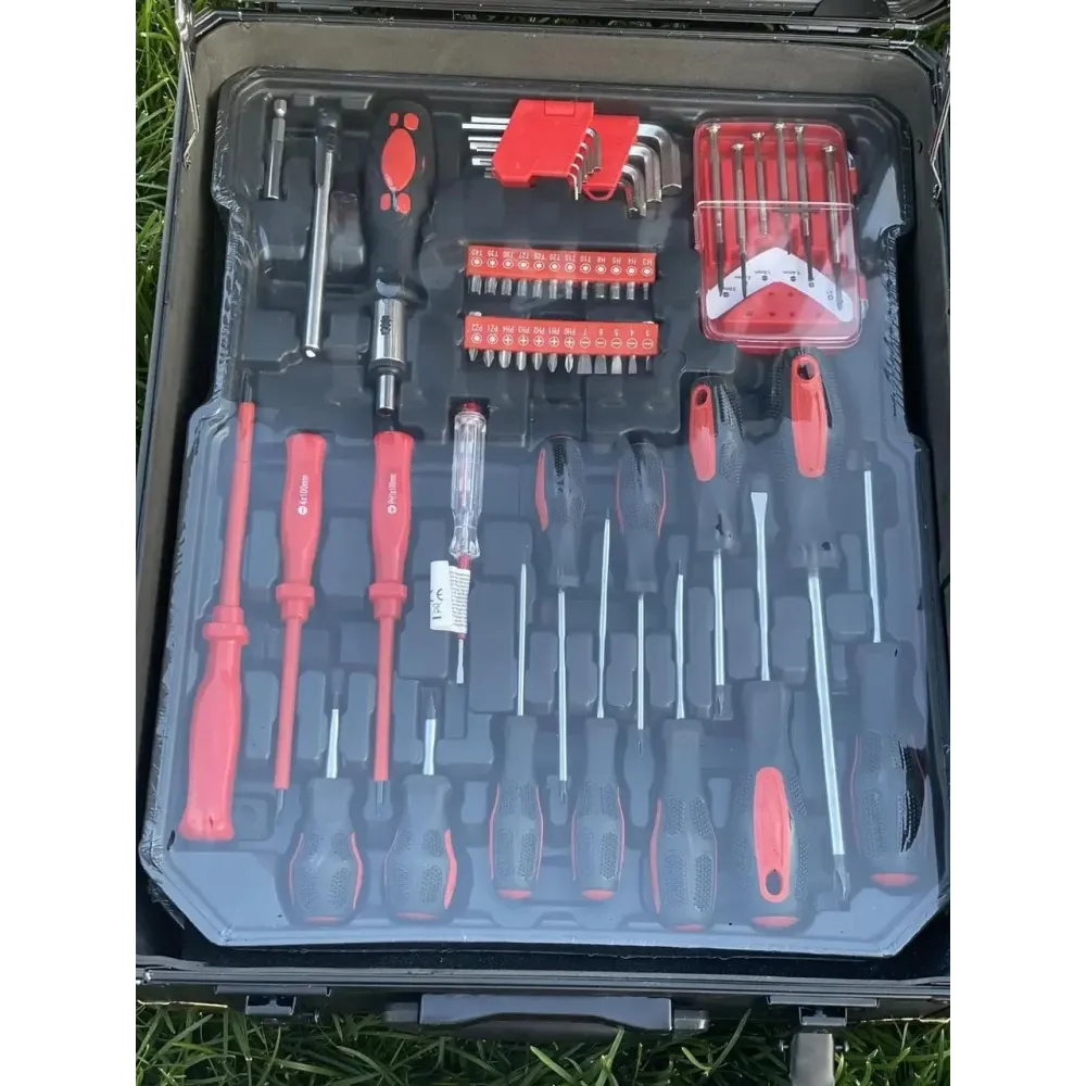 Большой профессиональный набор инструментов в чемодане 408 предметов · Универсальный набор инструментов для дома и авто с трещеткой – это ваша универсальная мастерская, которая всегда с вами. Он продуман так, чтобы вы не нуждались в покупке отдельных дополнительных инструментов, а имели всё необходимое, собранное в одном месте. 408 деталей набора позволят вам быть во всеоружии в любой ситуации, при любой поломке или ремонте.