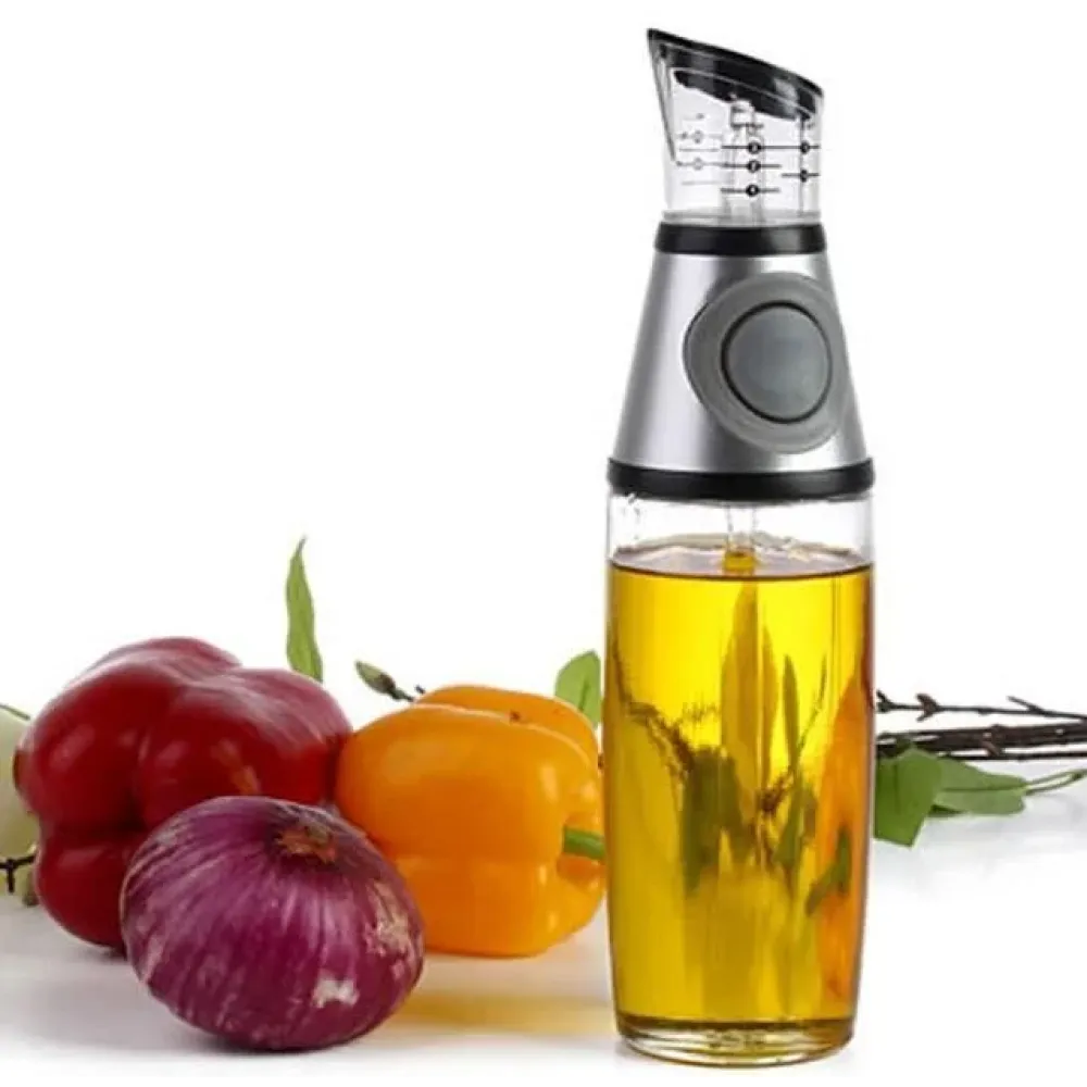 Бутылка – диспенсер с дозатором для масла и уксуса ∙ Нажимной масляный дозатор для оливкового и подсолнечного масла Press and measure имеет основной контейнер, в который и помещают жидкость. При желании можно в него поместить не только масло, но и уксус. Такие бутылки отлично подходят для хозяек, которые любят на кухне использовать несколько видов масла и уксуса. Также приспособление оборудовано специальным дозатором. Это позволяет выдавать необходимое количество жидкости. Для того чтобы бутылка могла выполнять эту функцию, есть специальная кнопка. При нажатии на нее выделяется необходимое количество масла. Контейнер изготовлен из стекла, что позволяет долго служить ему и не портить вкус жидкости. Сверху бутылка имеет дополнительный контейнер, на котором есть отметки. Каждая из них говорит об объеме в чайной или столовой ложке. Такое приспособление хорошо помещается как в холодильник, так и в обычный кухонный шкаф. Объем бутылки составляет 0,5 литров. В нее можно помещать любую жидкость. Некоторые даже в таки бутыли заливают жидкость для мытья посуды.