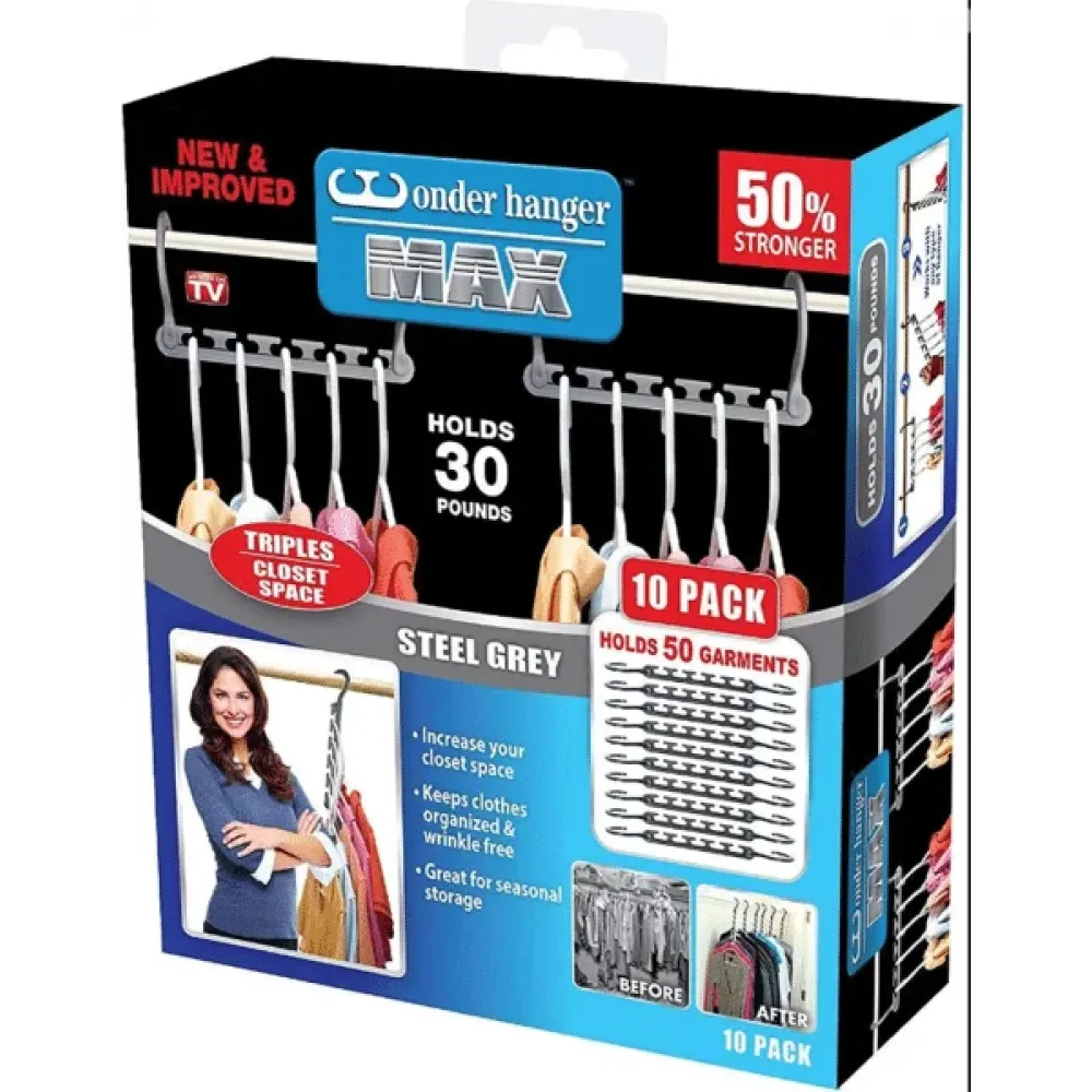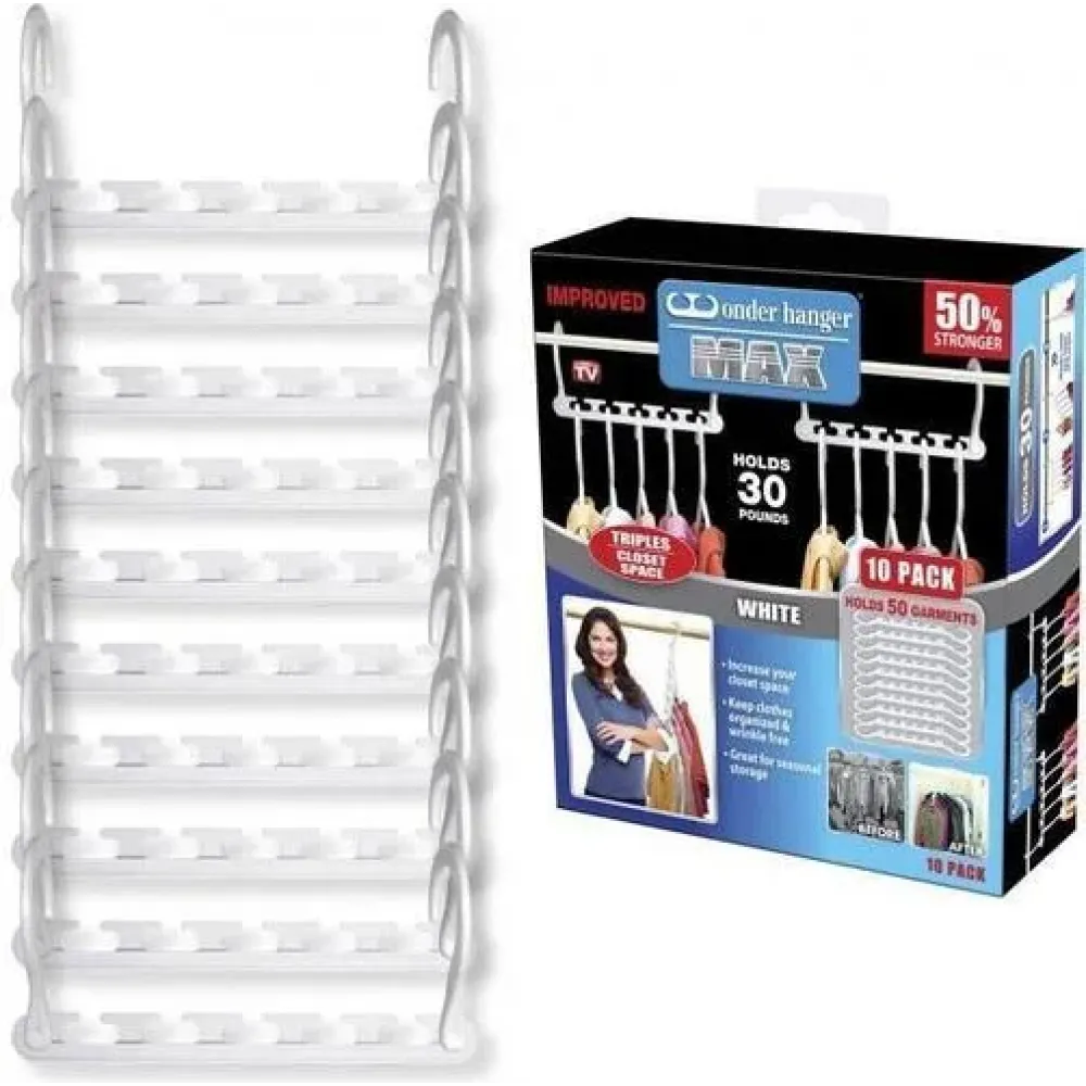 Вещи надежно удерживаются зажимами, юбки вешаются на специальные петли. Универсальная вешалка требует минимум места в шкафу и при транспортировке. В одном наборе содержится 10 вешалок. Каждая вешалка имеет пять небольших перекладин. Чтобы разместить одежду на Wonder Hanger , необходимо выдвинуть перекладину.
