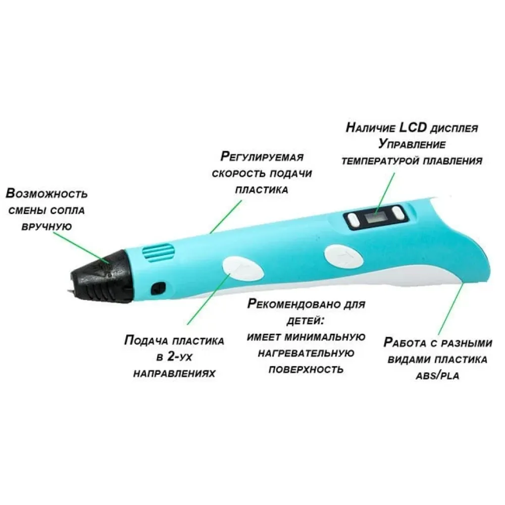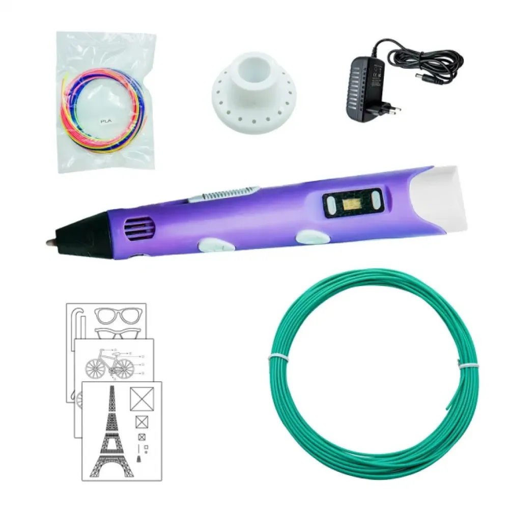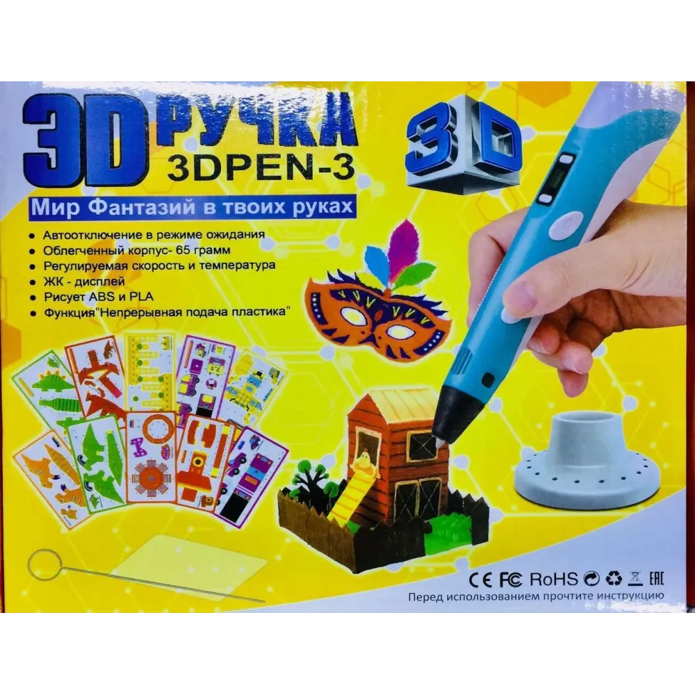 Инструкция: Шаг 1. Подключение 3D ручки. Подключите адаптер питания в разъем электропитания и подключите его к источнику питания. Загорится жёлтый индикатор включения, на экране высветится выбор пластика, и ручка перейдет в режим ожидания. Клавишами возле экрана выберите нужный тип пластика. Шаг 2. Разогрев 3D ручки. Нажмите на кнопку подачи пластика, индикатор готовности загорится красным цветом и 3D ручка начнет нагреваться. Время полного нагрева около 30-ти секунд, после чего индикатор готовности загорится зеленым цветом. При необходимости, дополнительно отрегулируйте температуру нагрева пластика. Шаг 3. Загрузка пластика в 3D ручку. Возьмите пластик ровным концом и вставьте его в отверстие для загрузки пластика. Нажмите и удерживайте кнопку подачи пластика до тех пор пока пластик не выйдет из сопла. Ручка готова к использованию. Шаг 4. Регулировка скорости. Для настройки скорости нужно изменить положение контроллера скорости. В положении ближе к носику будет медленная скорость, в положении к концу 3D ручки - быстрая. Шаг 5. Извлечение или замена пластика. Для того чтобы изъять пластик из 3D ручки нужно нажать кнопку извлечения пластика, и подождать полного выхода пластика. Для замены пластика повторите шаг 3. Внимание! Не допускайте, чтобы пластик свободным концом приближался к отверстию для загрузки пластика ближе чем на 5 см. В противном случае пластик будет невозможно изъять и потребуется добавить пластик в 3D ручку и помочь ручке перейти на новый пластик. Извлекайте пластик после завершения работы. Не рекомендуется использовать детям до 8 лет без присмотра родителей. При работе с ABS пластиком не желательно работать более 30 минут в непроветриваемом помещении. Примечание: Детская 3D Ручка для рисования и создания объемных моделей 3DPen-3 с дисплеем + трафареты + 10 м пластика + подставка в наборе будет автоматически переходить в режим ожидания, если не используется более 3 минут. В режиме ожидания светится желтый индикатор питания, а на экране написано SLEEP. Чтобы возобновить работу нажмите на кнопку подачи пластика. Не оставляйте ручку в режиме ожидания без присмотра, или на длительный строк! Преимущества: