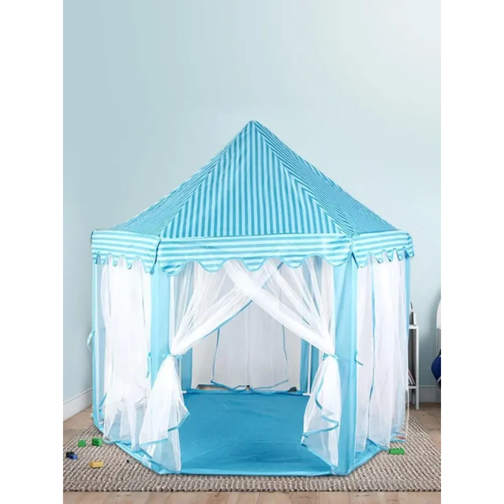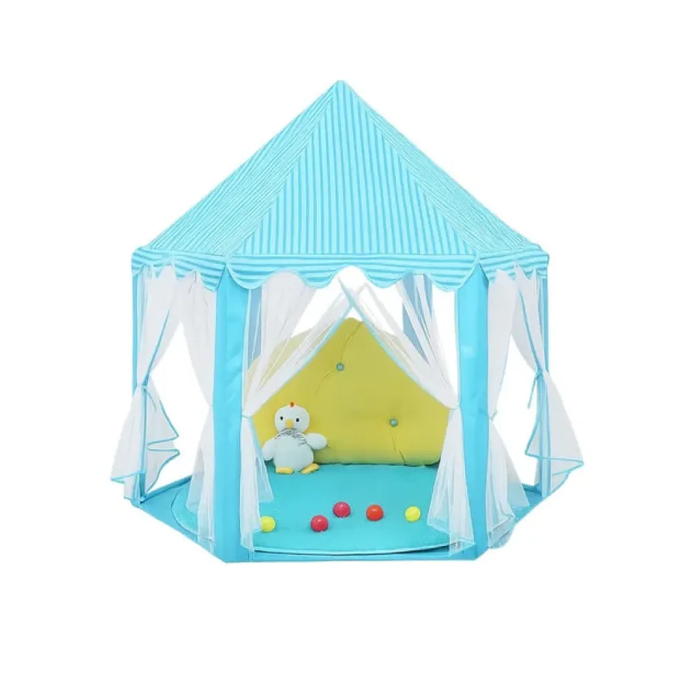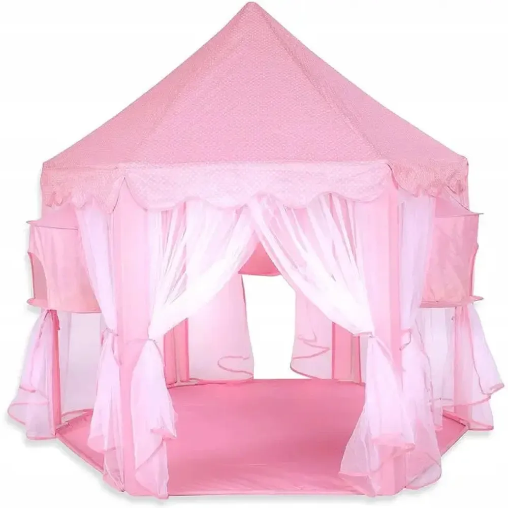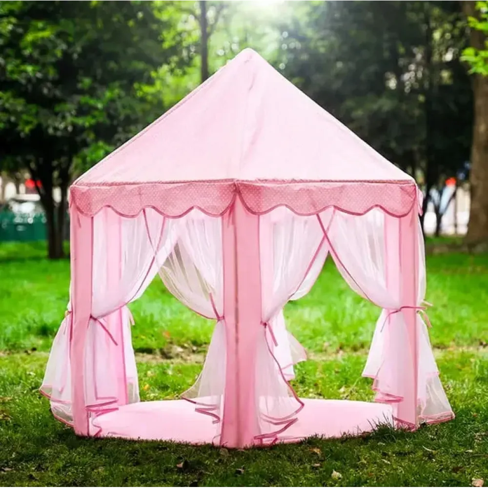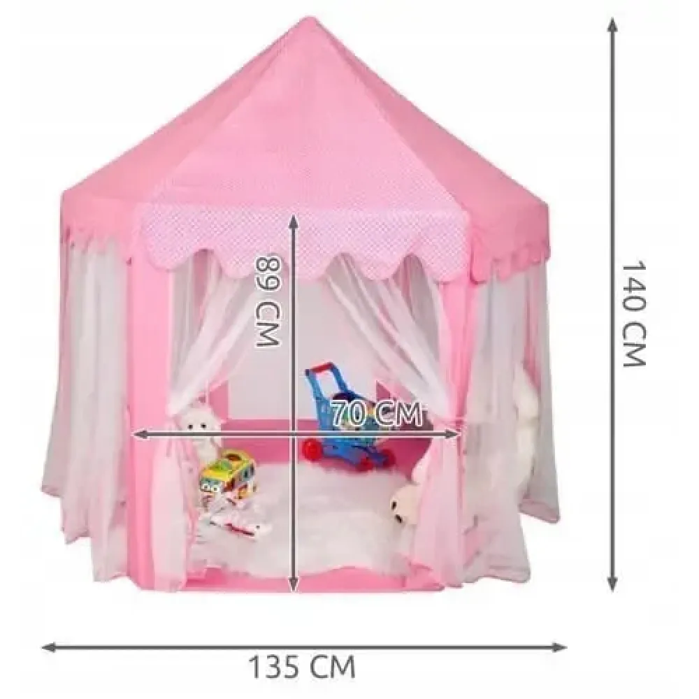 Палатка имеет 6 входов с полупрозрачными занавесками, которые можно завязать лентами, создавая уютное и волшебное пространство для игр, чтения, сна или ролевых приключений. Безопасные материалы, лёгкий вес и стильный дизайн делают этот шатёр идеальным подарком для девочек и мальчиков.