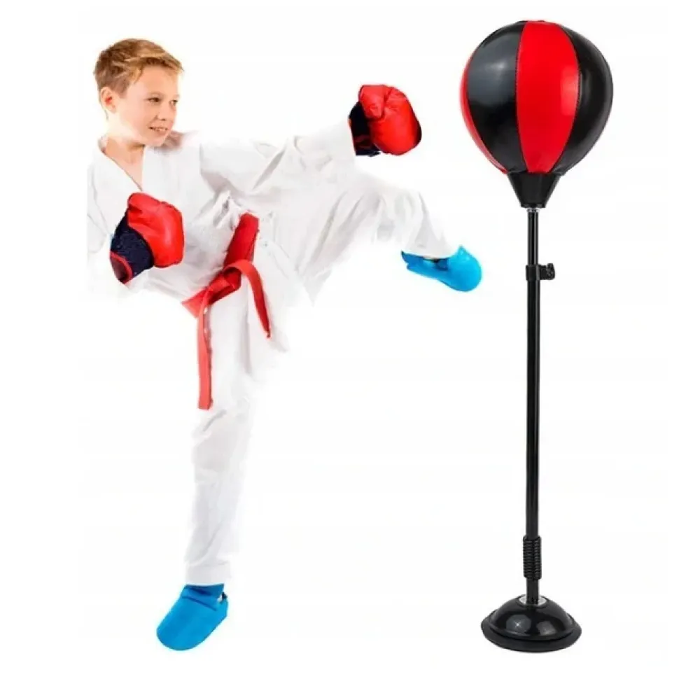 Боксерские перчатки весом 6 унций (для детей и начинающих боксеров) Боксерская груша установлена на крепком устойчивом основании и укомплектована стойкой из прочного металла. Может использоваться в помещении и на улице. Предназначен для детей старше 4-х лет. Боксерский набор легко и просто устанавливается.