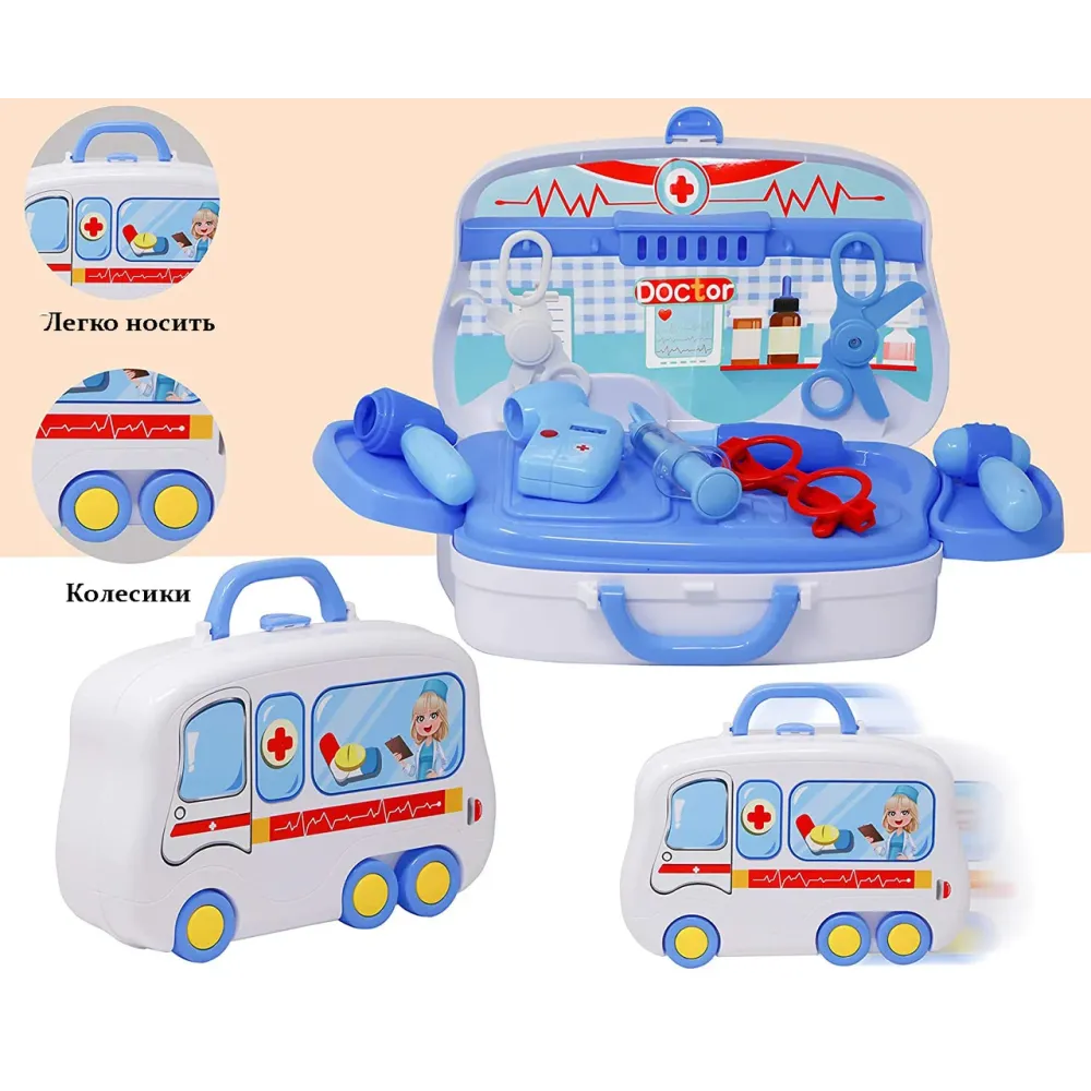 С таким набором малыш почувствует себя настоящим доктором и устроит поликлинику или больницу прямо у себя дома! Друзья или любимые игрушки станут пациентами с разнообразными придуманными диагнозами. В чемоданчике-машинке удобно складывать все аксессуары, хранить дома и брать с собой в гости или в поездки.