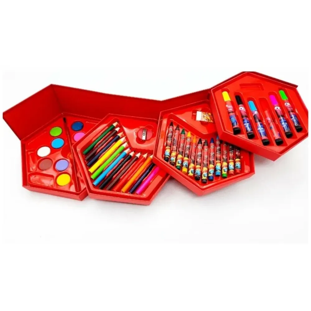 Детский художественный набор для рисования и творчества "Тачки", 46 предметов в боксе-шестиграннике очень удобно раскрывается на секции, в которых помещается 46 предметов, и компактно складывается в компактную коробочку-шестигранник.
