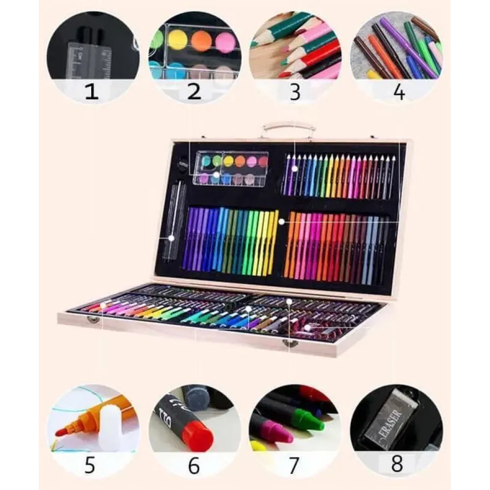 Наш Детский набор для рисования и творчества 180 предметов в деревянном чемоданчике-кейсе содержит цветные карандаши, фломастеры, акварельные краски, мелки и многое другое. Все что необходимо юному художнику в одном наборе. Отличный подарок для мальчиков и девочек имеющих склонность к изобразительному искусству. Эргономичное и компактное расположение принадлежностей, удобно в пользовании, при переноске и при хранении. Упаковка и материалы абсолютно безопасны, соответствуют санитарно-техническим нормам и стандартам качества SGS.
