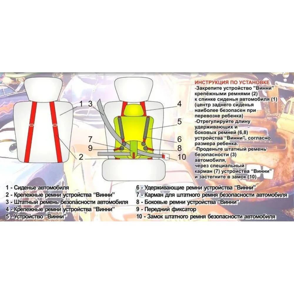 - Используется совместно с ремнём безопасности автомобиля