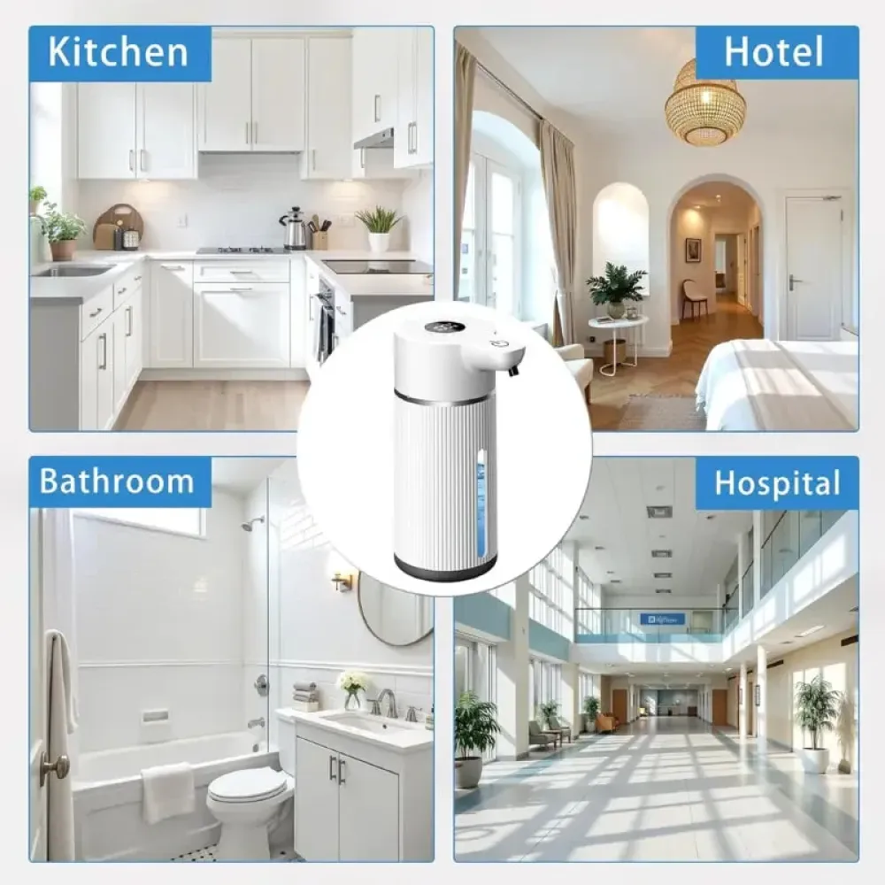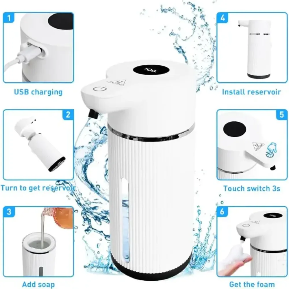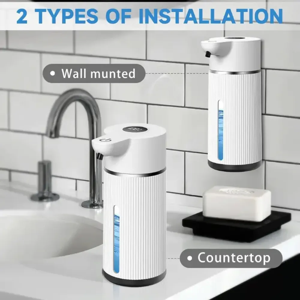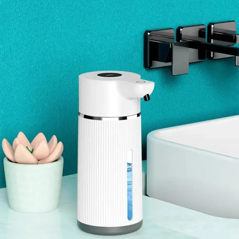 Устройство оснащено LED-дисплеем с 4 уровнями подачи мыла, емкостью 420 мл с прозрачным окошком для контроля жидкости и встроенным аккумулятором 1200 мАч для длительной автономной работы. Корпус из ABS-пластика защищён по стандарту IPX5, что делает дозатор безопасным в условиях повышенной влажности. Возможна настенная установка или размещение на столе.