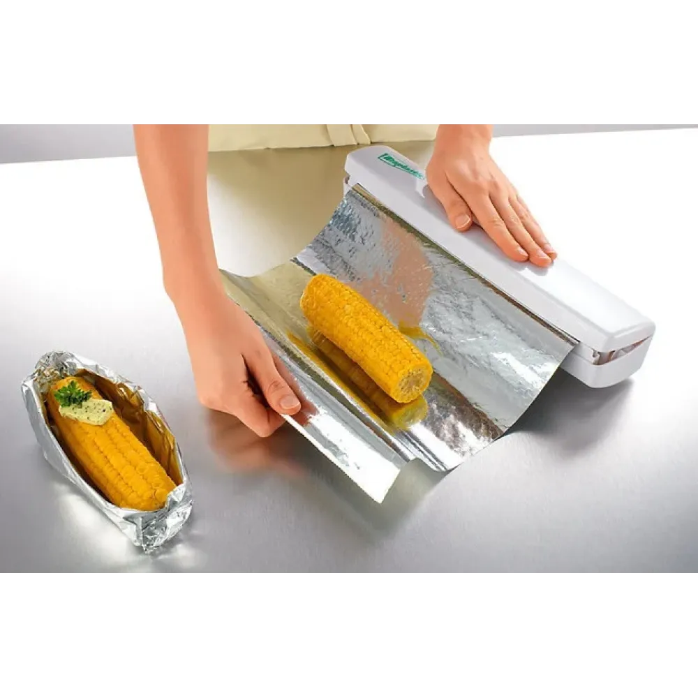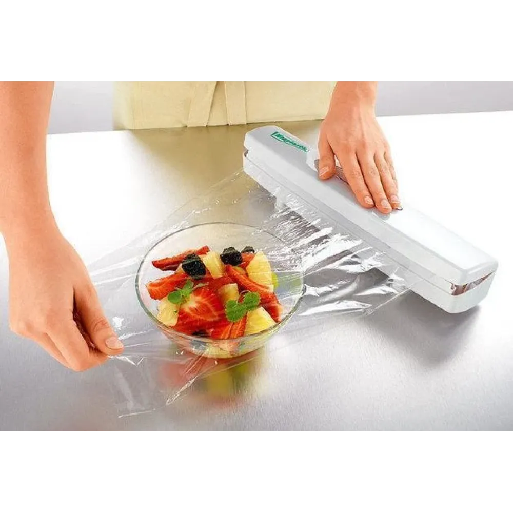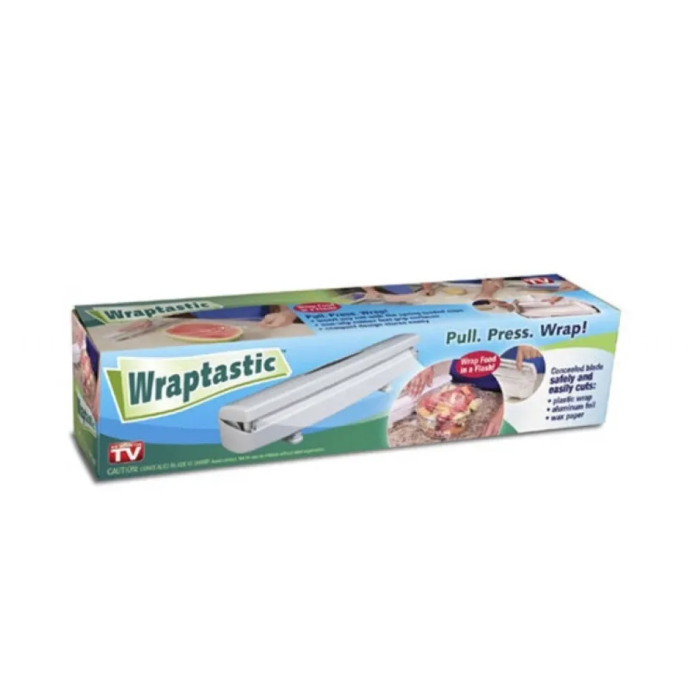 Диспенсер Wraptastic для хранения и отрезания пищевой пленки, фольги, пергаметной бумаги предназначается для хранения свернутой пищевой пленки, бумаги или фольги, которые закрепляются при помощи специальных держателей, расположенных в ёмкости приспособления. Устройство Wraptastic гарантирует удобное использование в домашних условиях, а так же в ресторанах. Принцип работы совершенно простой. Вам потребуется отмерить необходимую длину пленки, а затем совершить всего лишь одно нажатие на крышечку, которая её ровно разрежет.